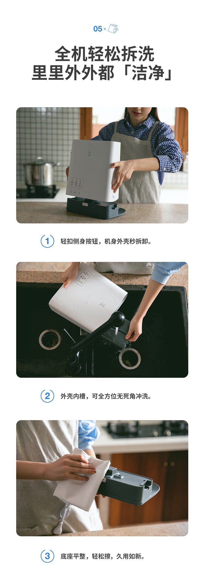 细节上:大容量合理分区,砧板外置不限大小,波浪形插刀槽、插刀紧、拔刀顺,使用轻松不费力;高矮分区坡度,加快沥水;智能安全防护,如果工作状态下拆机、立即停止并报警,防止紫外线暴露。