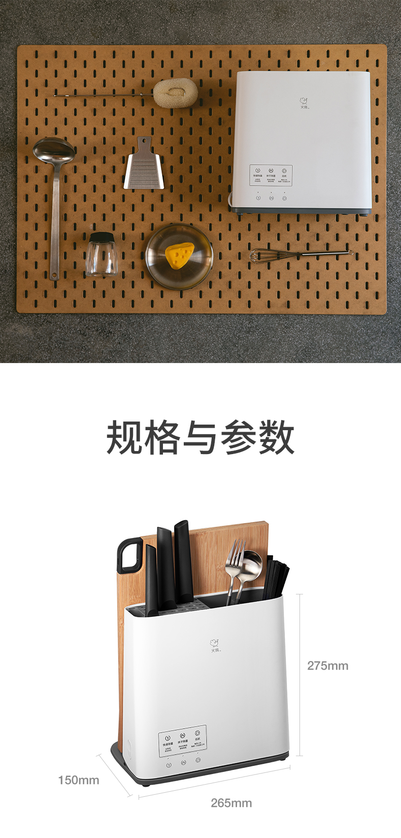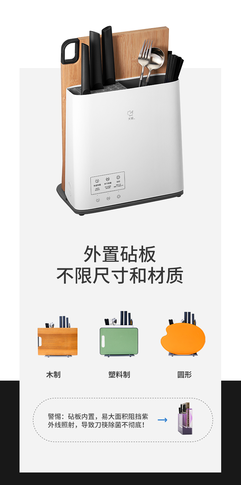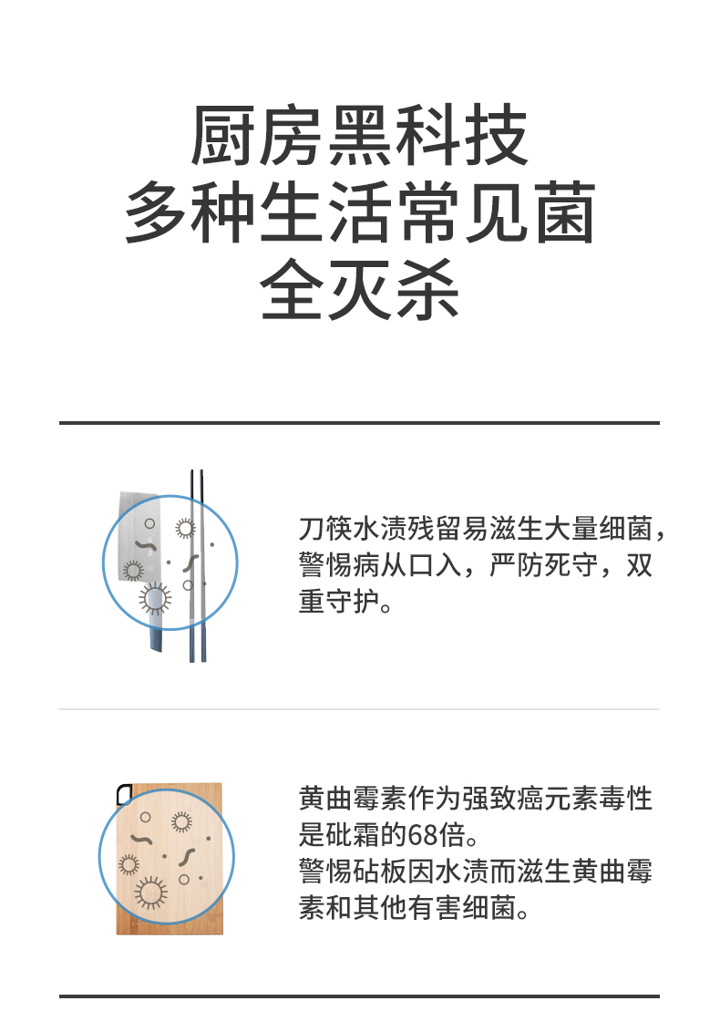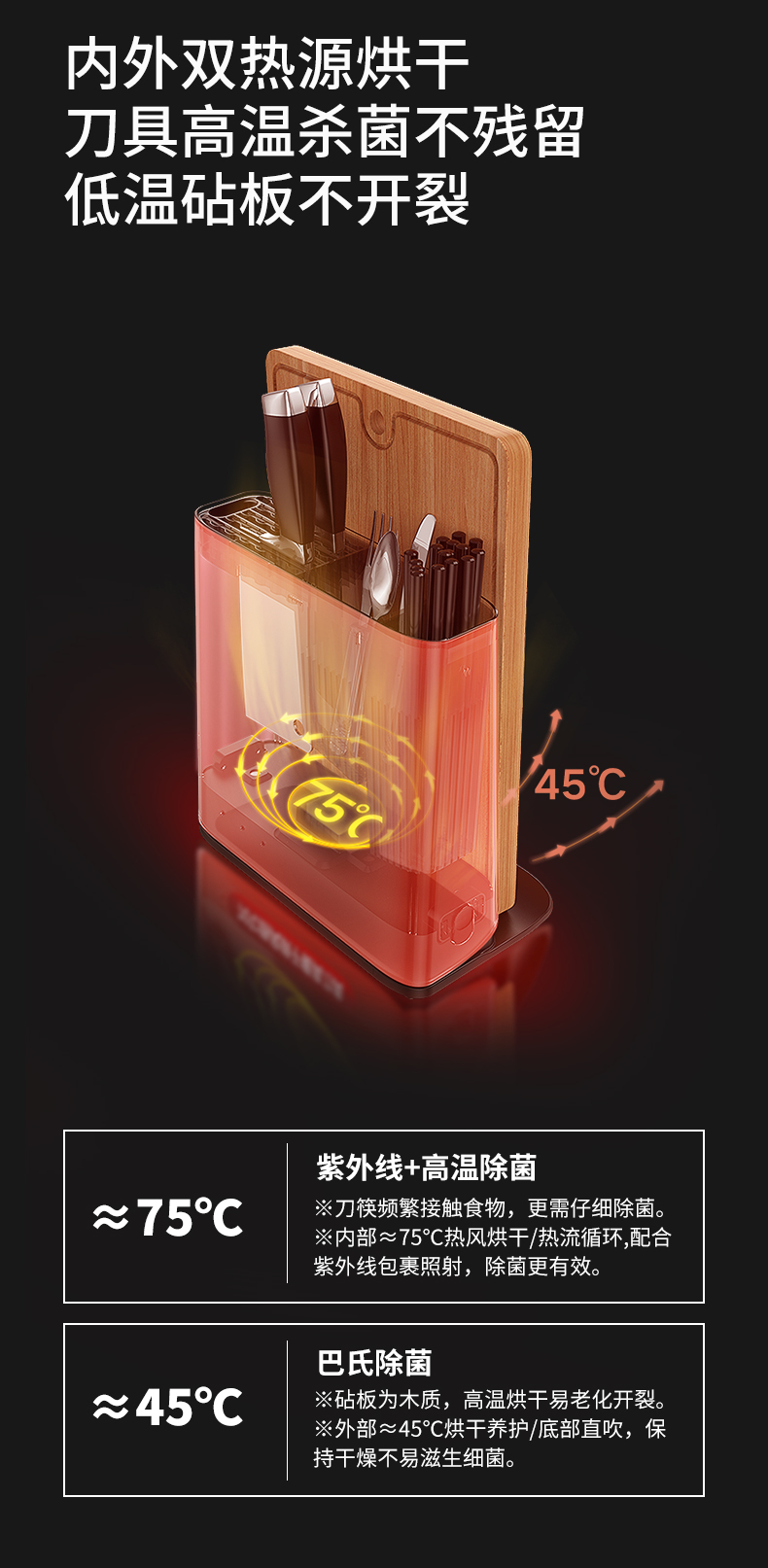 外部:45℃巴氏除菌/底部直吹,保障砧板干燥不易滋生细菌。