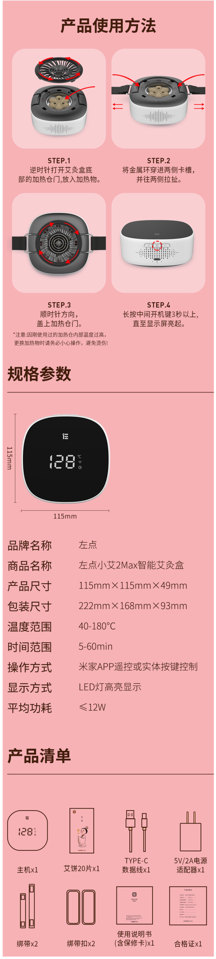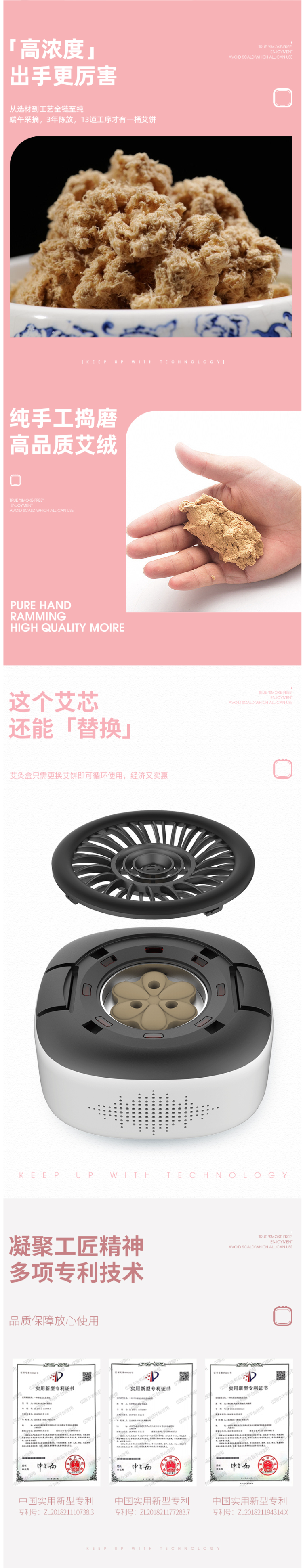 内置进口温度传感器,能精准穴位艾灸,高温释放艾草红外线,能深层渗透肌底穴位,使用时无烟雾产生,还防烫,高温自动断电,具有效缓解颈椎病、腰椎病、宫寒痛经、温阳补虚等功效。