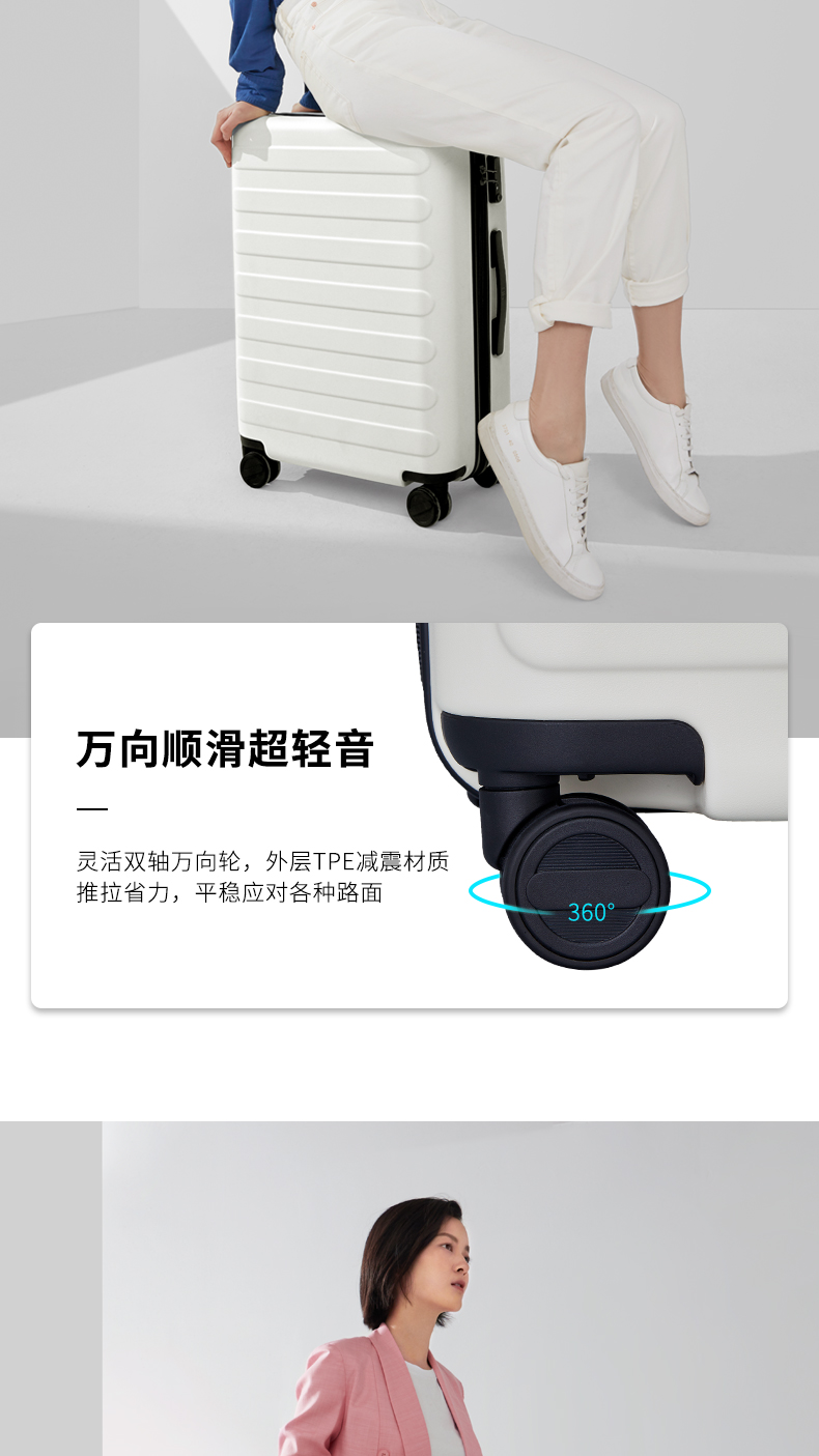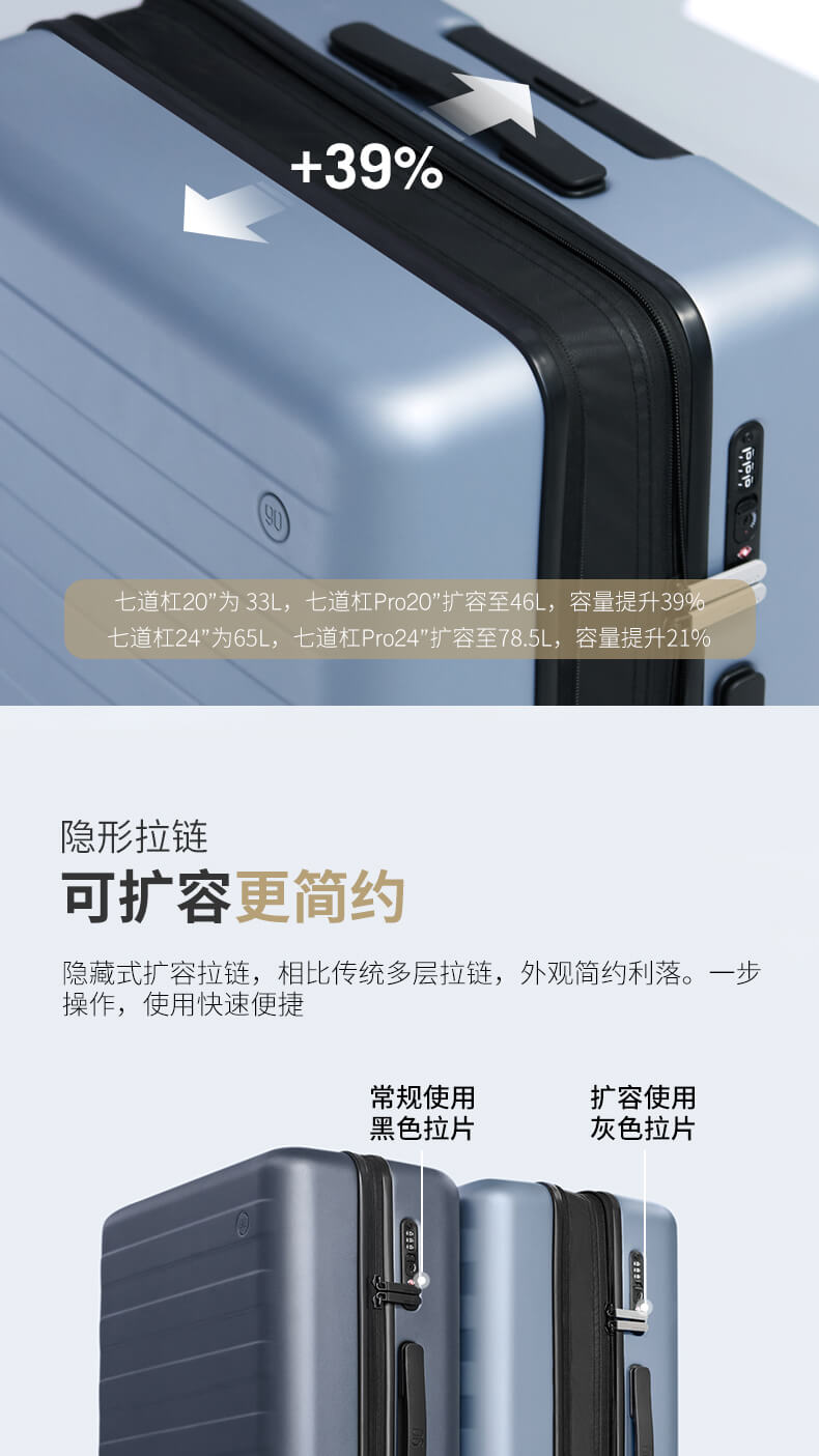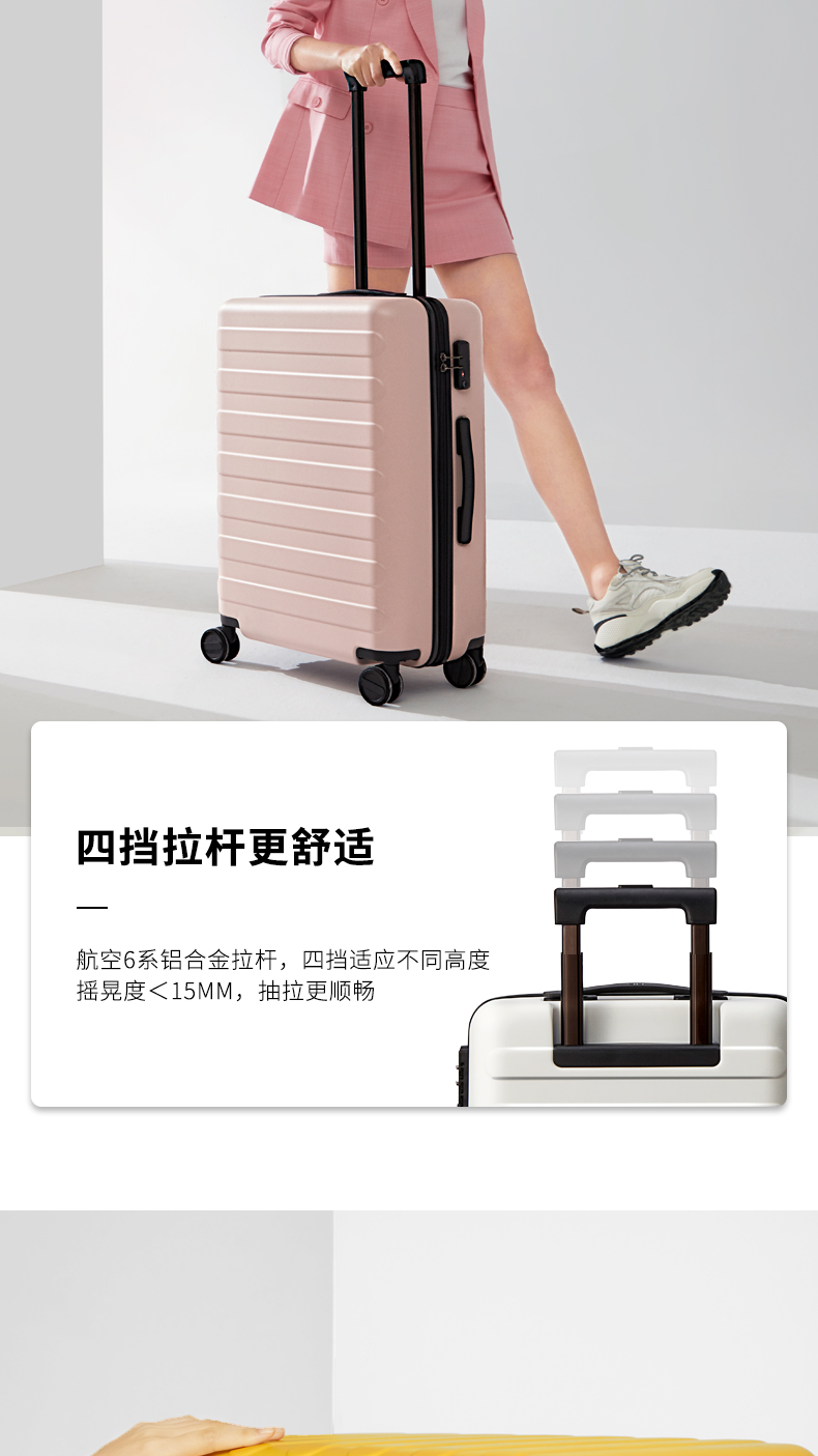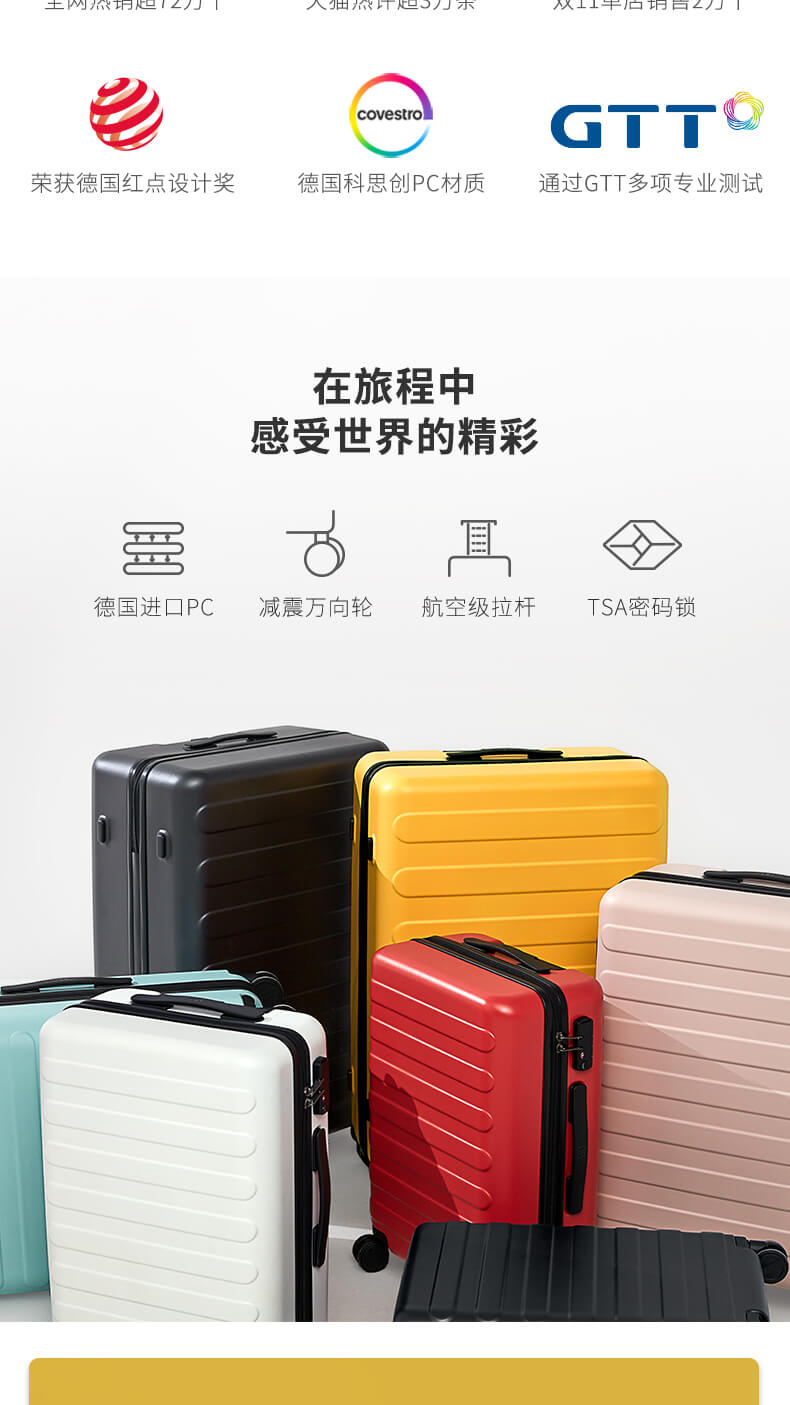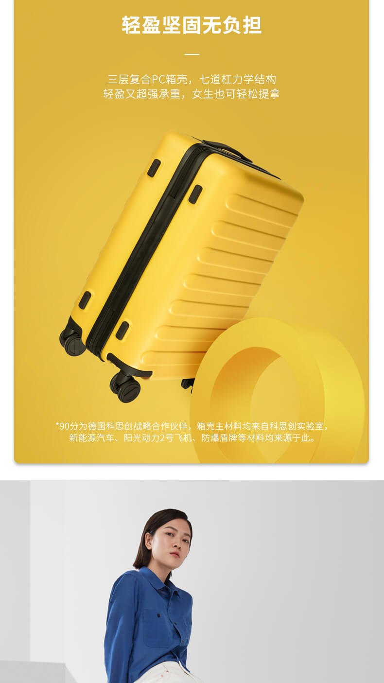这款90分 20寸七道杠拉杆箱,是2018年红点奖作品,累计热销72万+,标准登机箱,定位超轻量级,登过进口PC材质,三层复合箱壳,强韧耐剐蹭,科学力学结构轻盈又承重,女生也可轻松提拿。