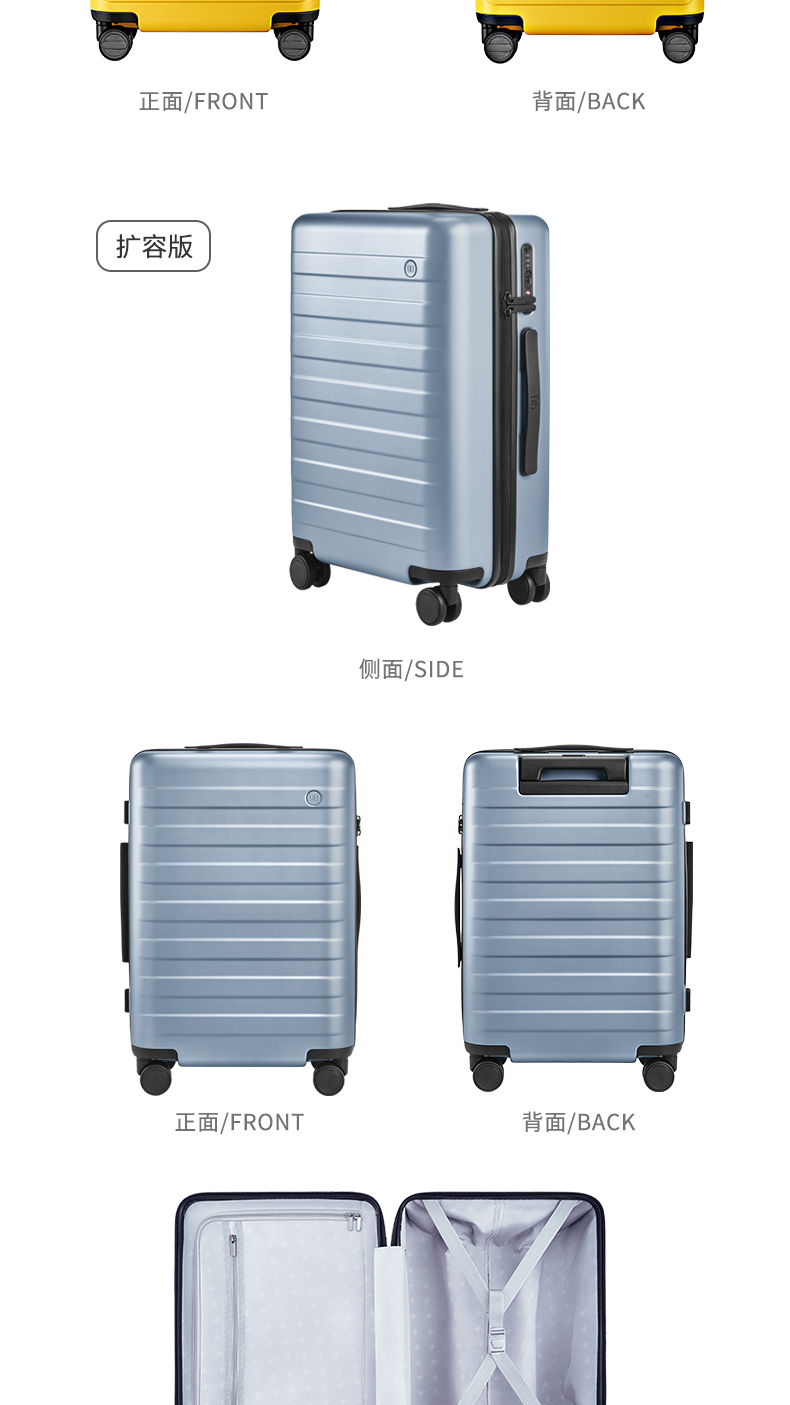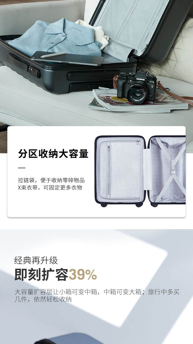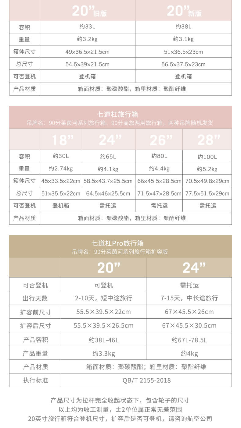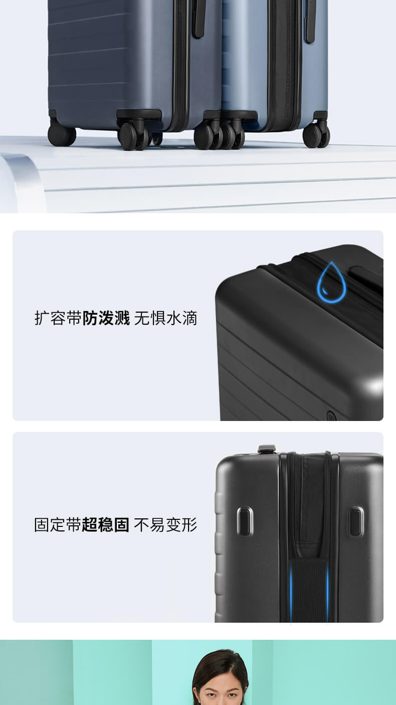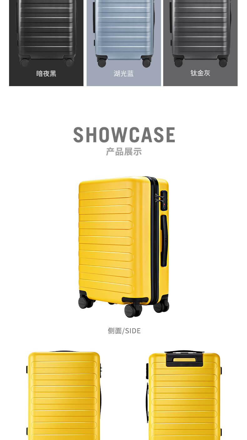 这款90分 20寸七道杠拉杆箱,是2018年红点奖作品,累计热销72万+,标准登机箱,定位超轻量级,登过进口PC材质,三层复合箱壳,强韧耐剐蹭,科学力学结构轻盈又承重,女生也可轻松提拿。