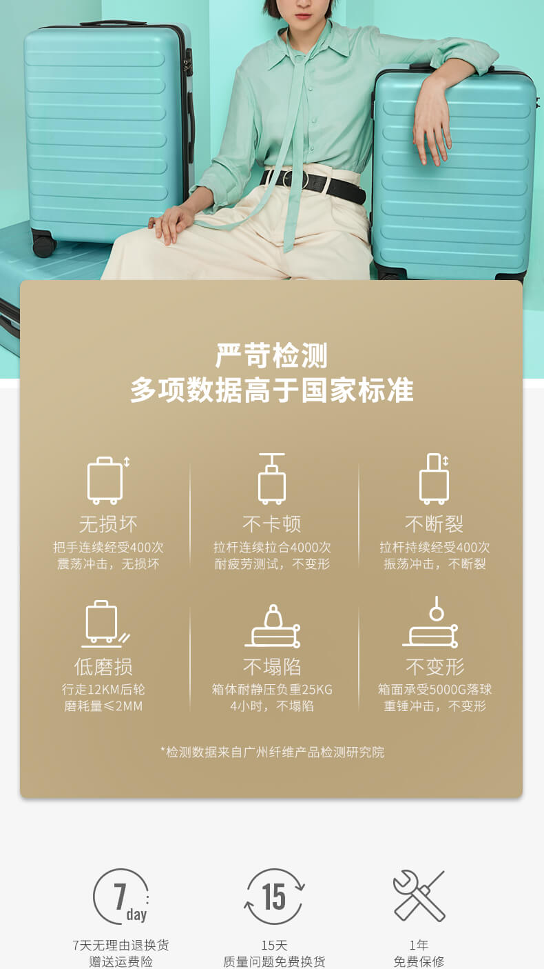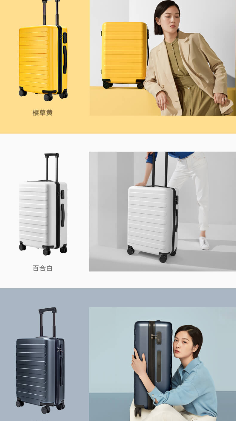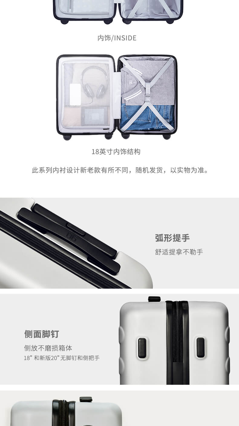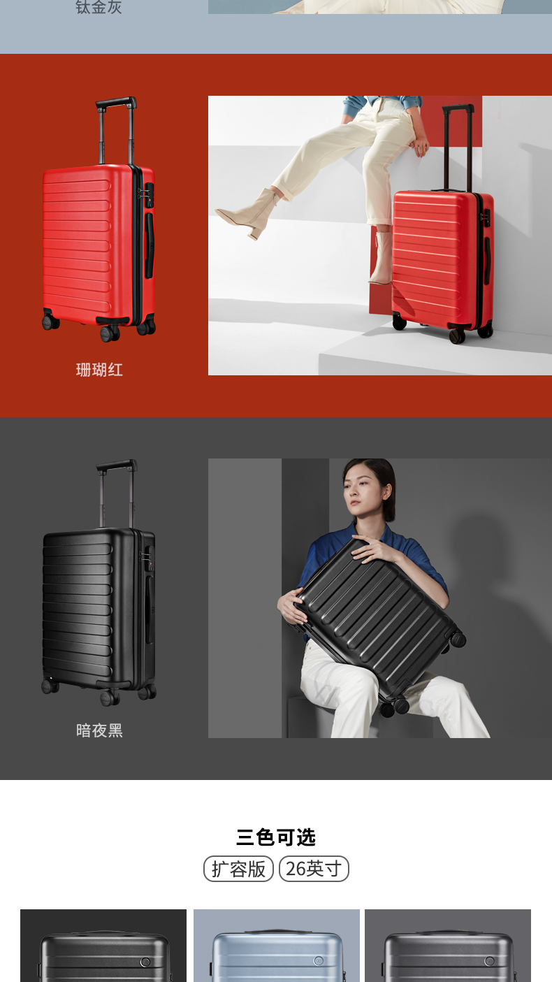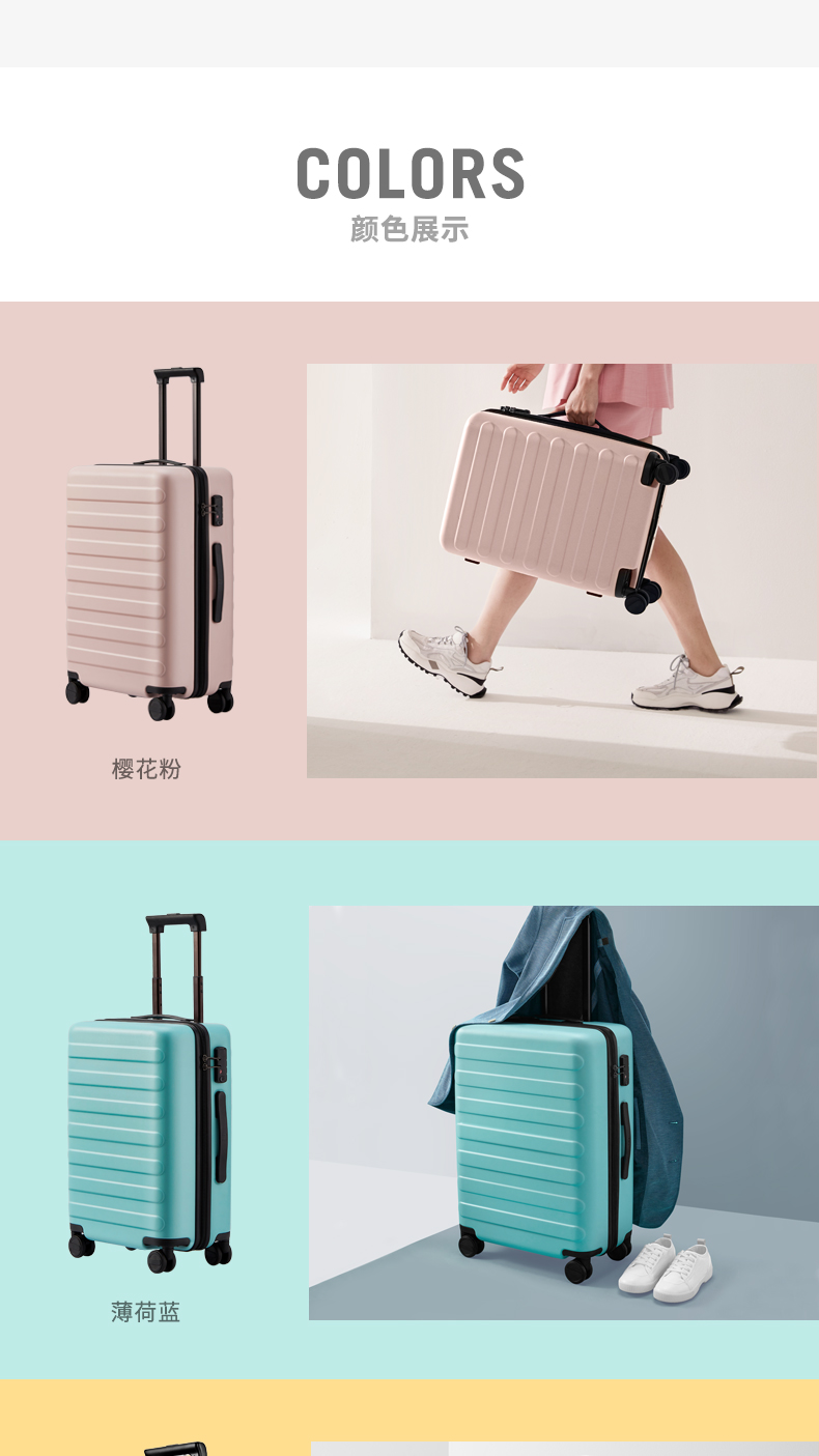 这款90分 20寸七道杠拉杆箱,是2018年红点奖作品,累计热销72万+,标准登机箱,定位超轻量级,登过进口PC材质,三层复合箱壳,强韧耐剐蹭,科学力学结构轻盈又承重,女生也可轻松提拿。