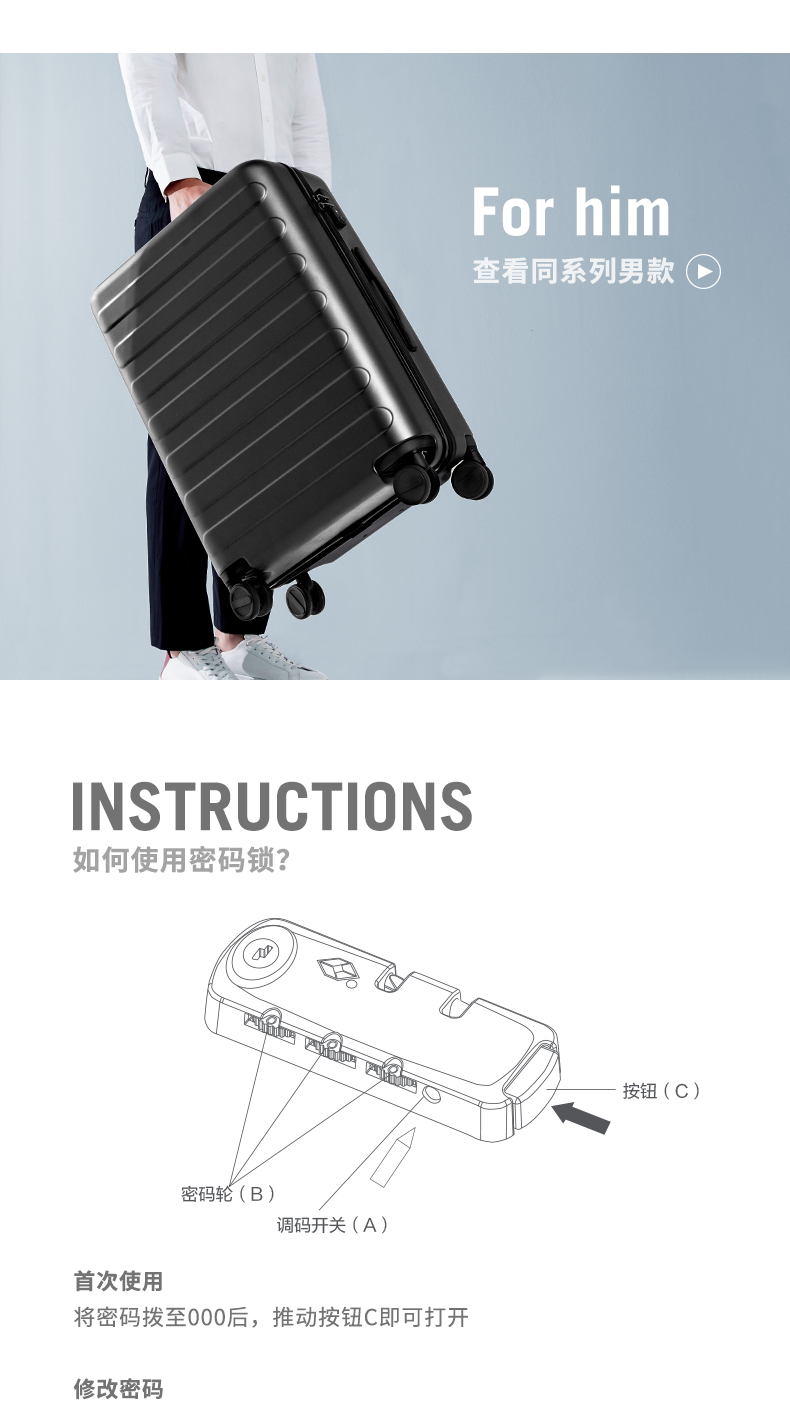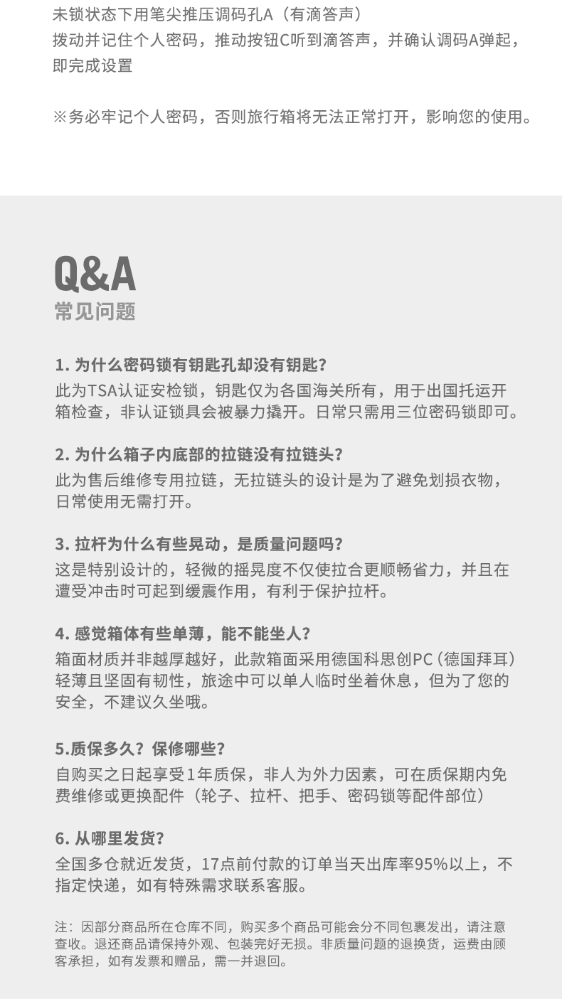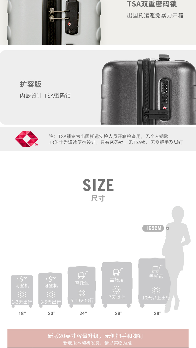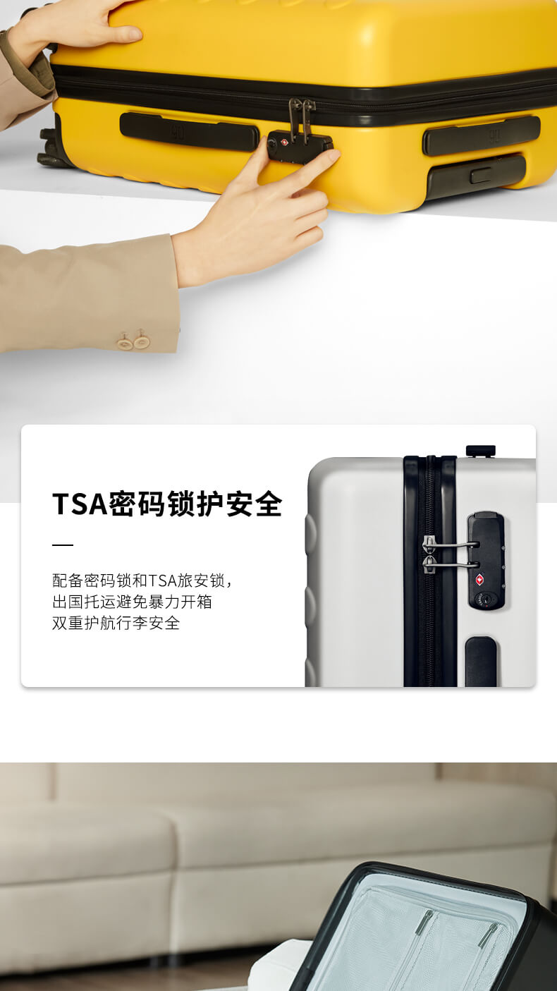 航空6系铝合金拉杆,四挡适应不同高度,摇晃度<15MM,抽拉更顺畅,配备密码锁和TSA旅安锁,出国托运避免暴力开箱,双重护航行李安全。