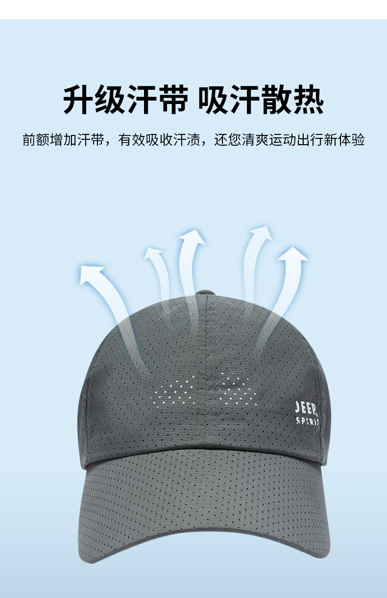 这款JEEP吉普帽子 男士透气防晒速干遮阳帽 鸭舌帽,优选速干面料,蜂巢型网面,轻盈透气,吸汗散热,有效透气排湿;帽内采用立体剪裁设计,硬朗挺阔,无压迫感;帽檐加,夏日出行更凉爽。