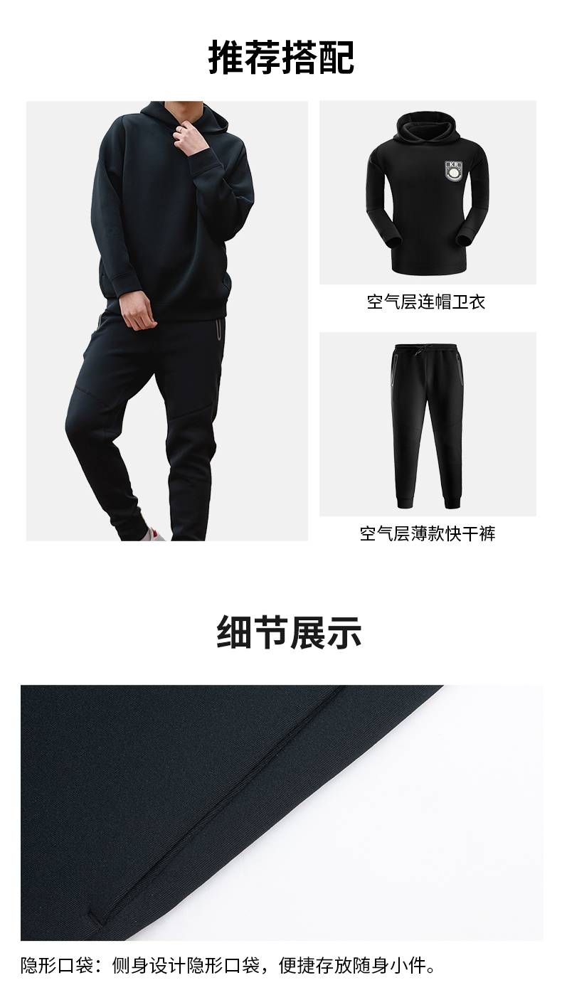 衣面底色是显瘦的纯黑色色调,搭配经典连帽套头卫衣款式,可以应对生活中多种场合搭配,耐穿耐看,休闲感十足。简约百搭。