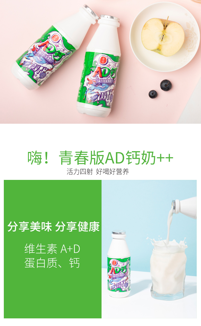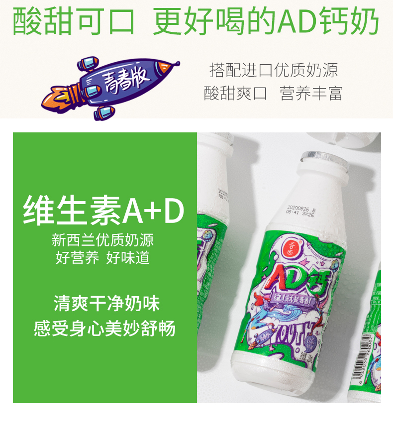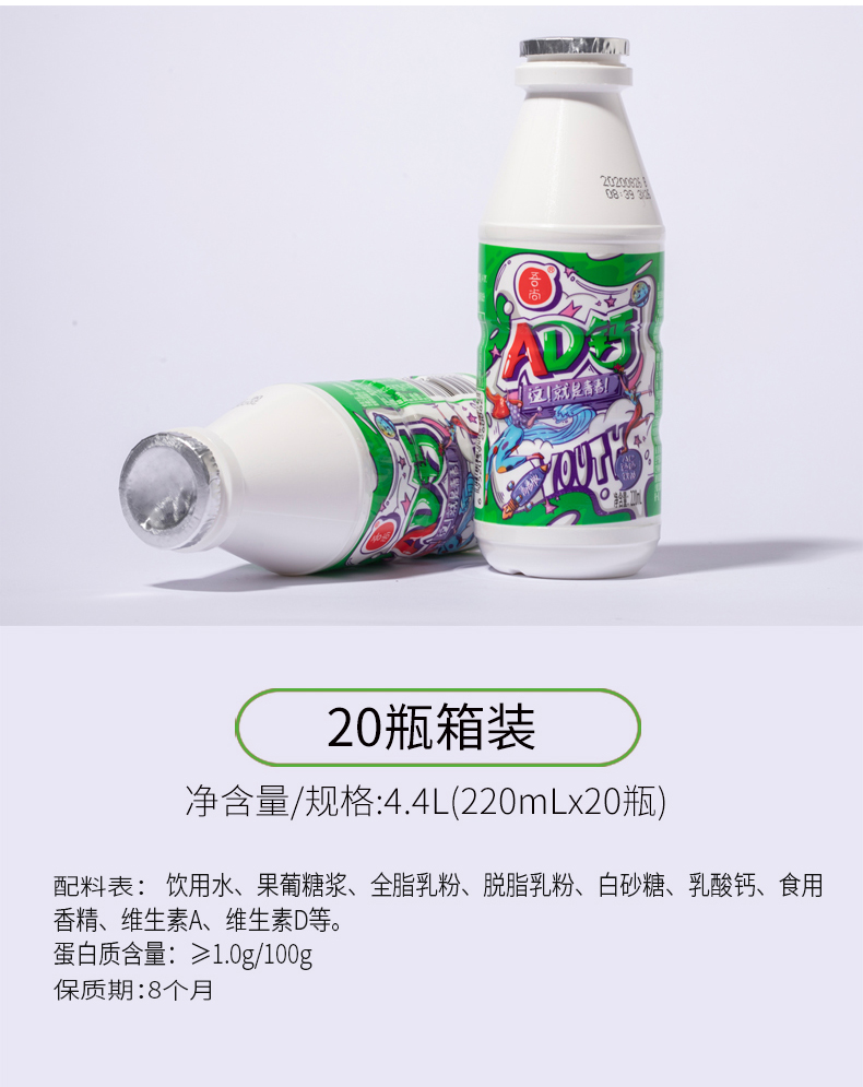 天猫超市次日可达。AD钙奶是娃哈哈旗下的饮品,这款吾尚青春版,采用新西兰优质牧场奶源为基础,辅以维生素A和维生素D等多种营养元素,酸甜可口,好喝又营养。规格:220ml*20瓶 礼盒装