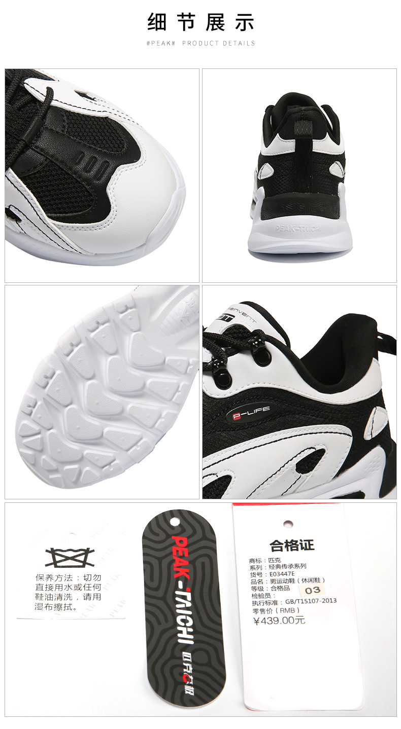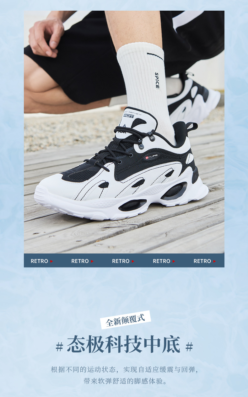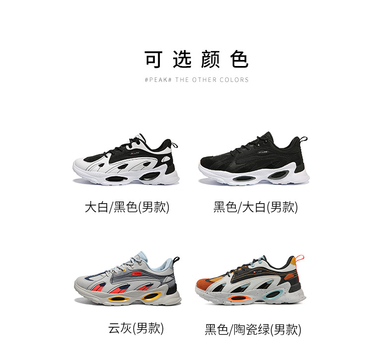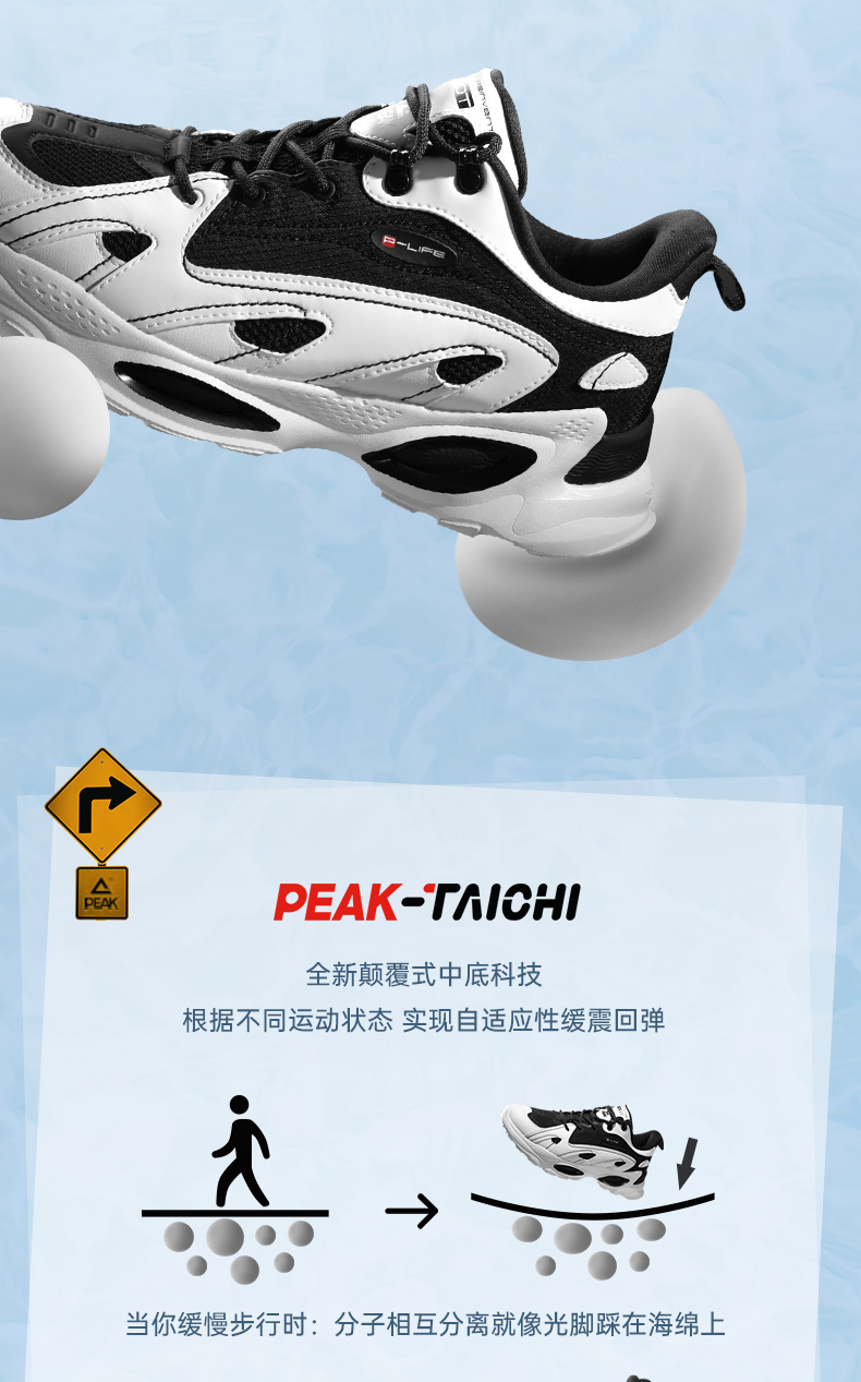 中底采用匹克核心黑科技的“态极”材料,能根据不同的运动状态,实现自适应缓震与回弹,带来柔软舒适的脚感体验,久穿不累,鞋底采用大颗粒底花,大大提升抓地能力,行走更加稳定踏实。