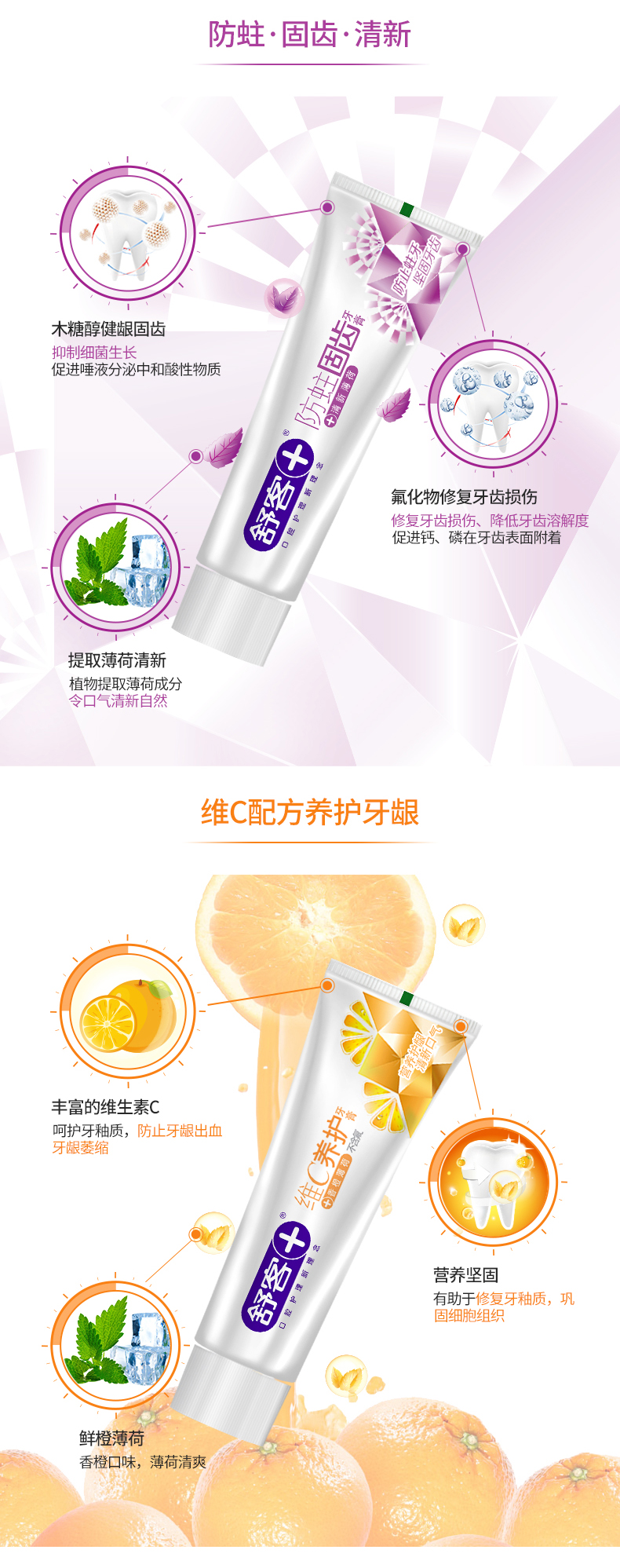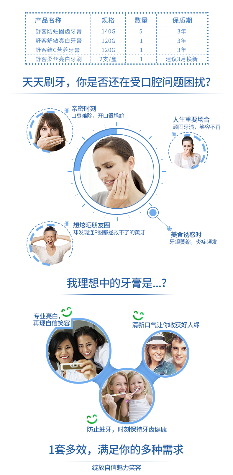 这款舒客 多效护理牙膏套装,有防蛀、亮白、维C营养三种,