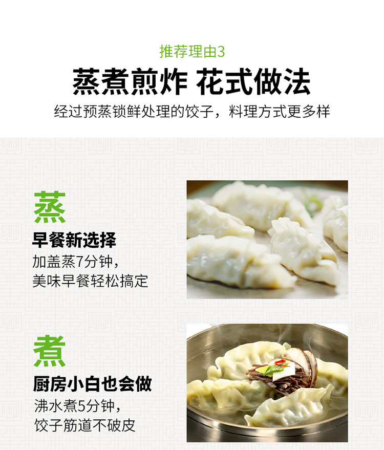 2.是熟冻的,意思是煮半熟后再冻起来的,自己煮的话比较容易熟,还能蒸煎炸都行,吃法多样,不需要专门买蒸饺或者煎饺了。