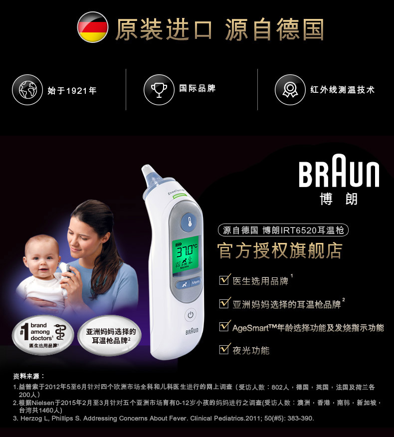 传统体温计需要5分钟测量时间,对于好动的宝宝来说用起来非常不方便,不过,耳温枪的出现解决了这一问题。BRAUN 博朗 IRT6520 是14年上市的旗舰机型,也是目前博朗最高端的型号。