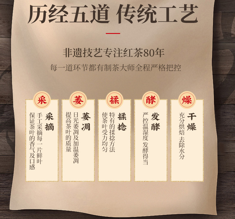 以云南大叶茶树鲜叶为原料,经过萎凋、揉捻、发酵、干燥等工序加工完成。其芽叶条索紧结,色泽乌润显毫,汤色红艳明亮,香气馥郁,滋味浓强鲜爽,具有独特的品质风格。