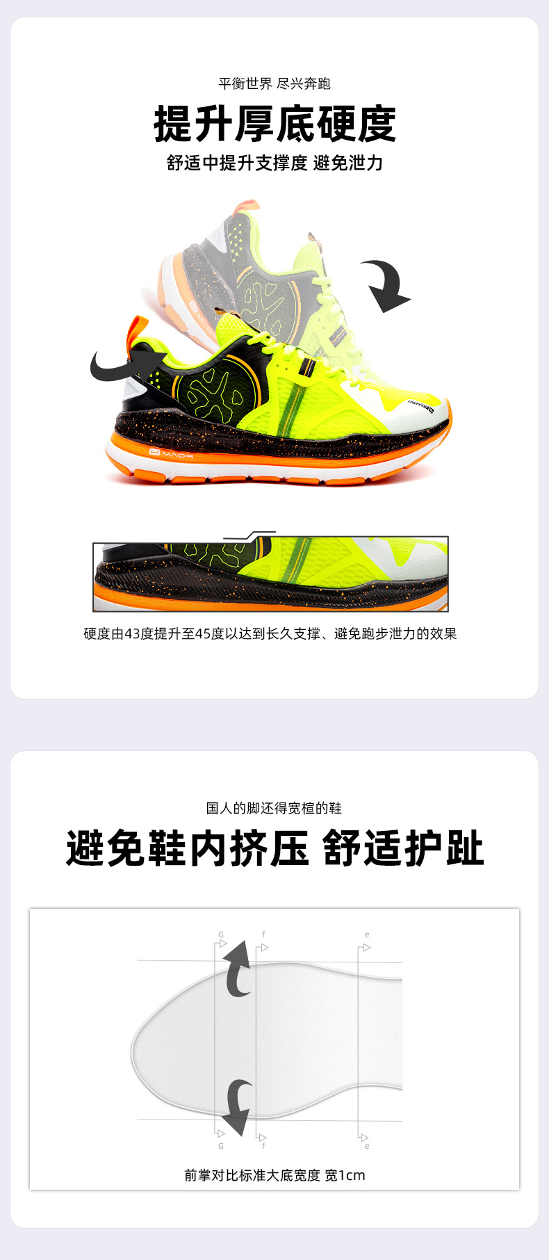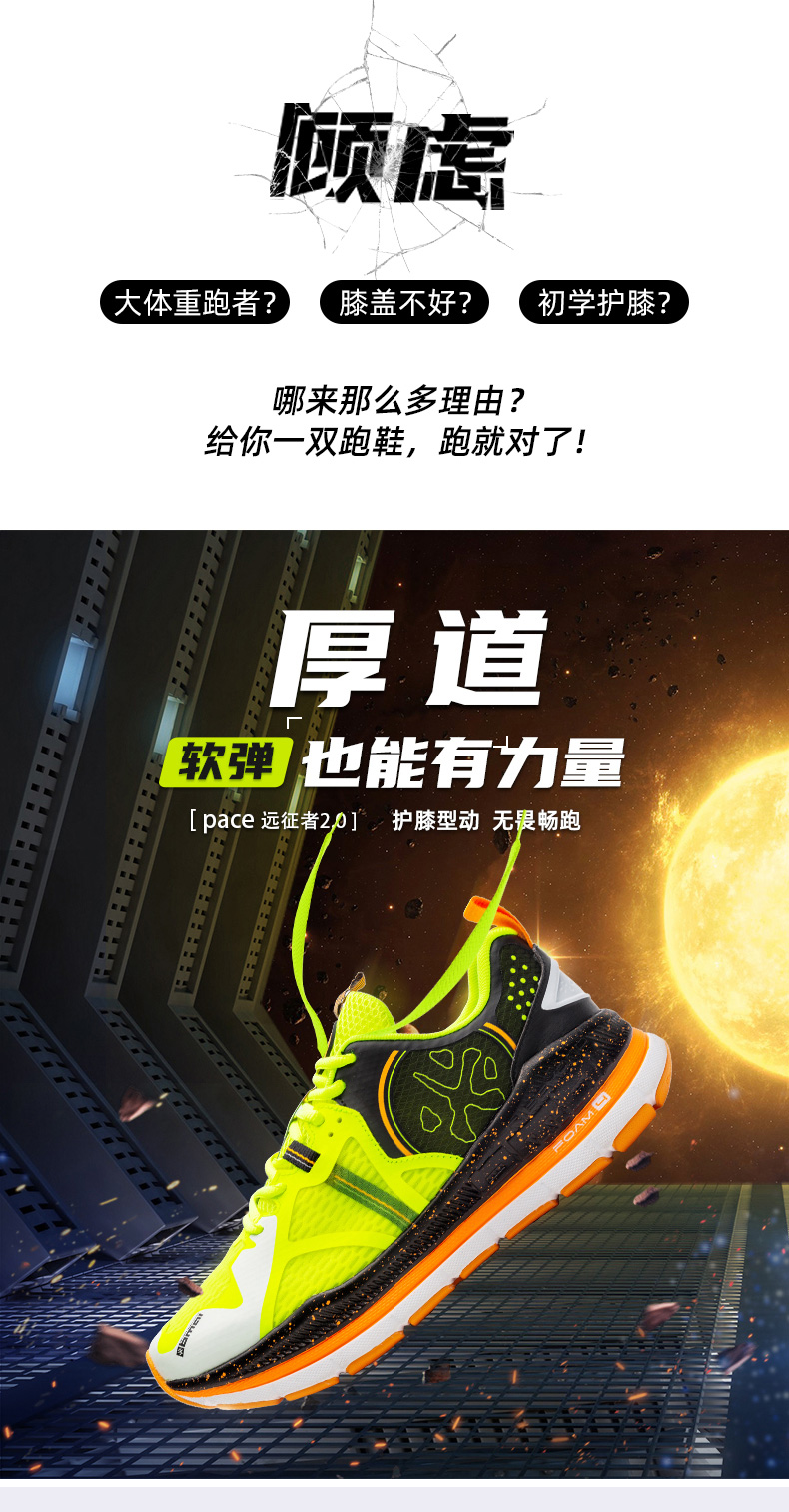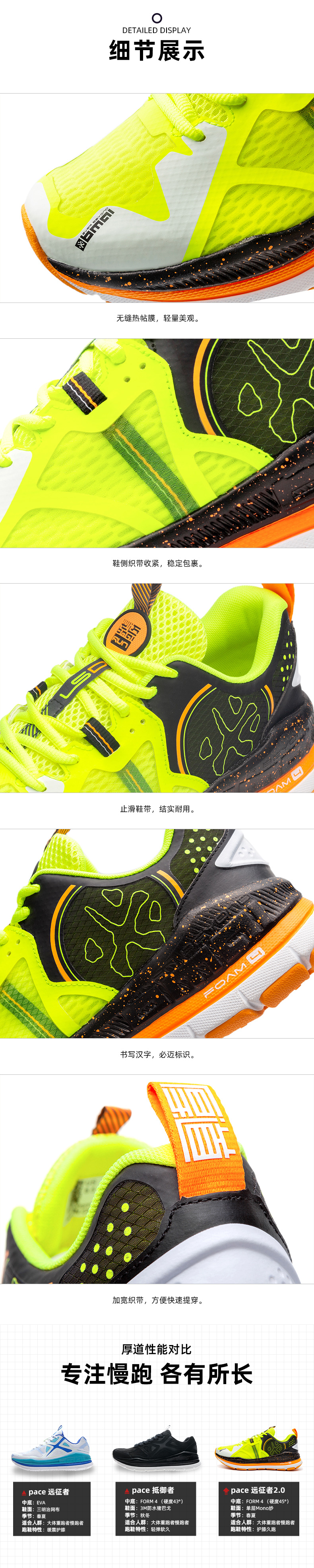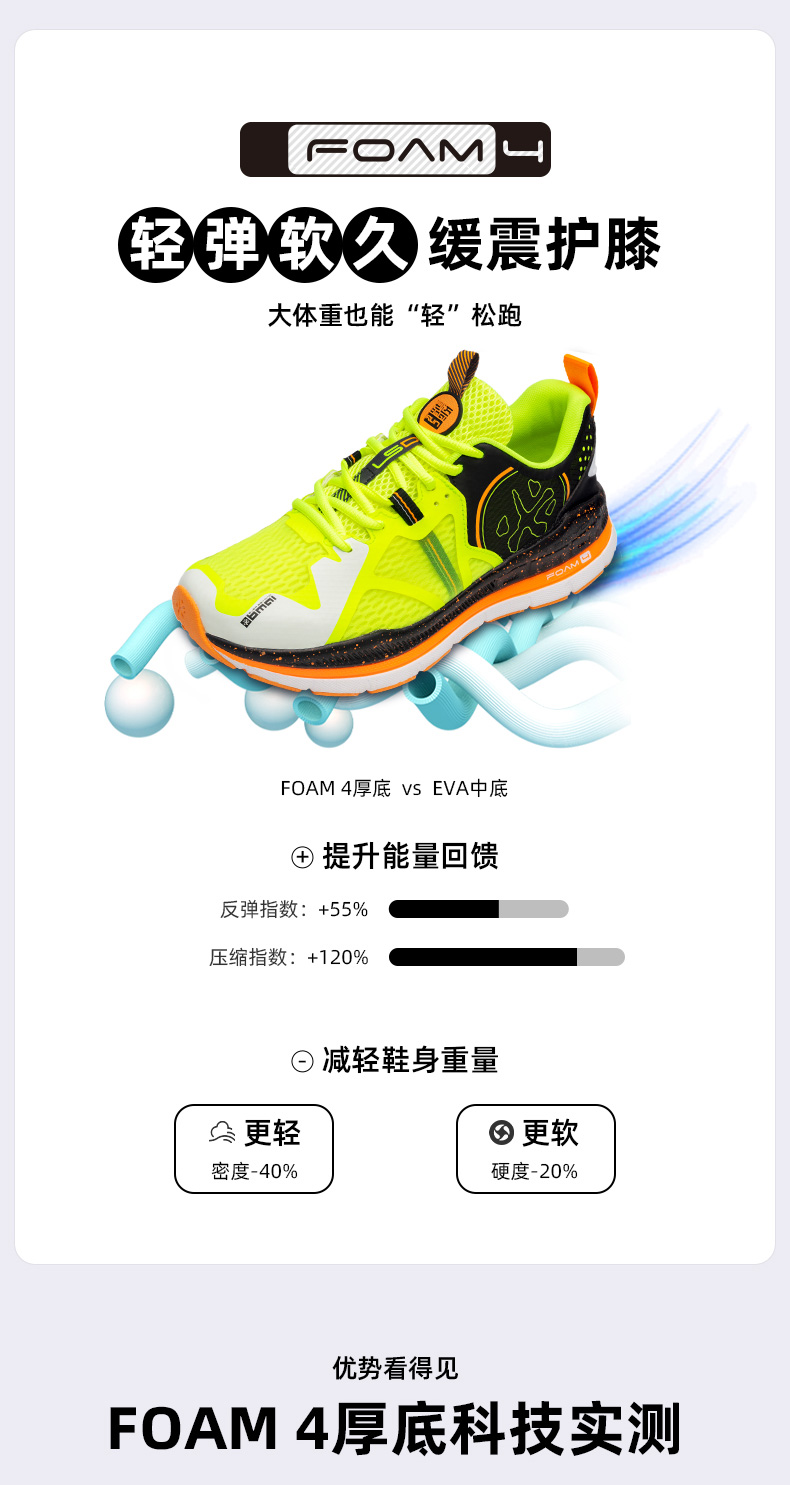 必迈Pace抵御者,是为大体重用户设计的长距离慢跑鞋,使用由超轻配方EVA缓震材料制成的FOAM 4全新科技中底,中底全掌比平常跑鞋厚约1cm,提供轻量优秀的缓震性能,大大缓解了膝盖与脚踝压力。