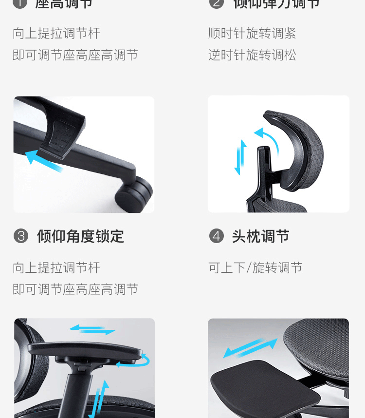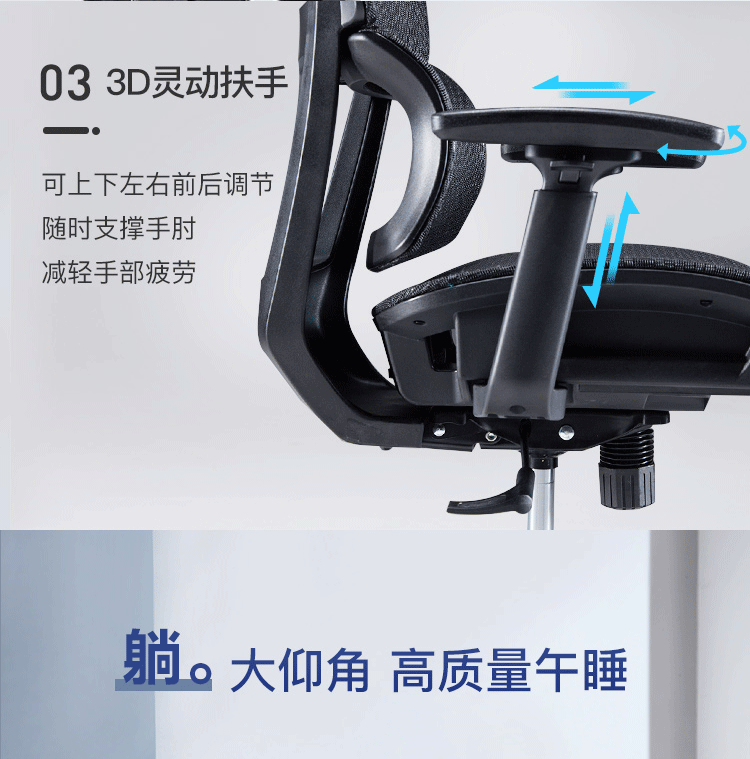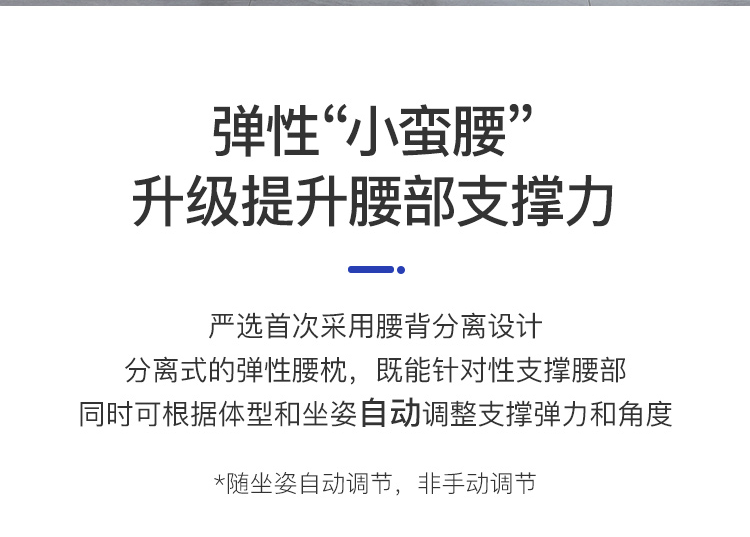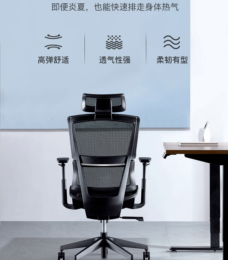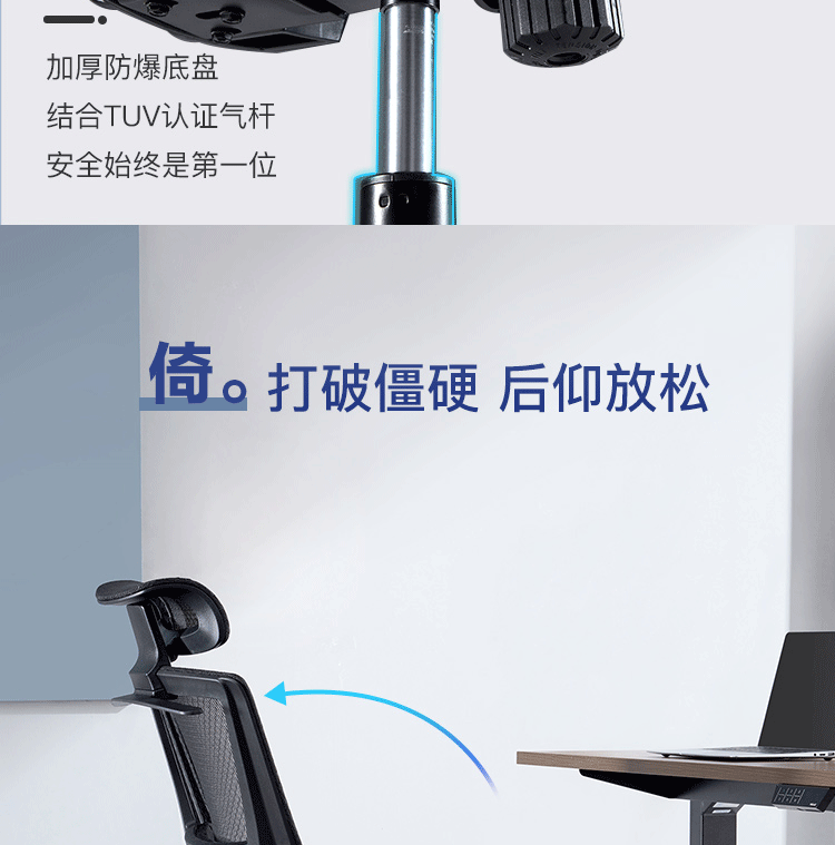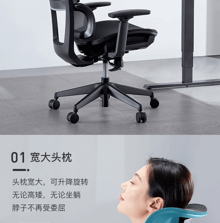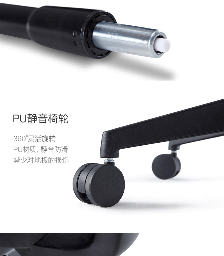给颈部提供舒适支撑的高弹网布头枕,可调节高度,有效缓解颈椎压力。PU软垫扶手,释放手臂压力。 莱特气杆,防爆加厚底盘,在防爆和承重力上升级保护。底端采用静压承重五星脚,自由旋转万向轮,座椅静态承重在1136kg左右,可以适应各种身形的人使用。
