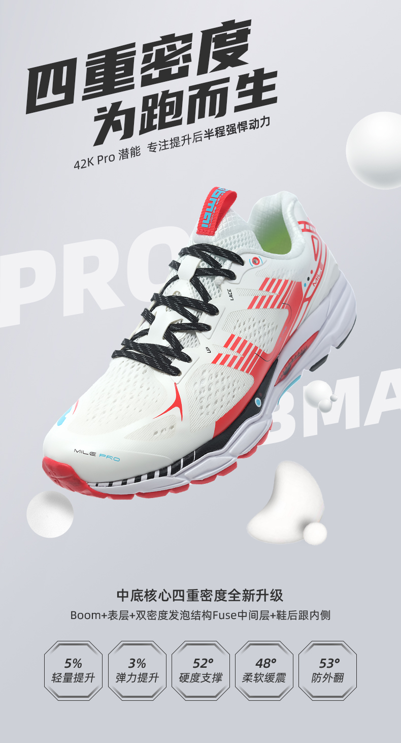 这双必迈Mile 42K Pro潜能 是定位全马拉松距离的42公里的专业跑步鞋,适合大多数人业余跑步爱好者,或者当做日常的跑步健身鞋。适合体重在45-70kg重的人穿,无论是公路和塑胶跑道都没问题。