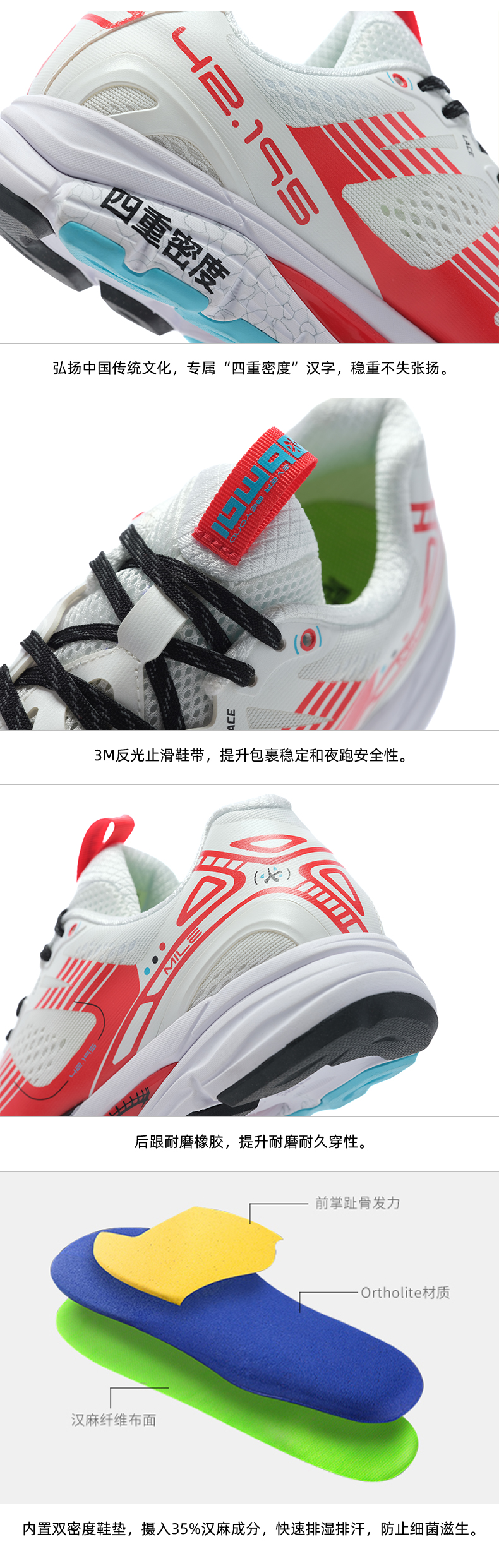 专为跑步者设计的双密度鞋垫,三层结构设计:前置前脚趾骨发力+中层Orthilite+底层汉麻纤维布,具有很强的吸汗、防霉、防臭等功能,使跑者脚时刻保持干爽舒适。