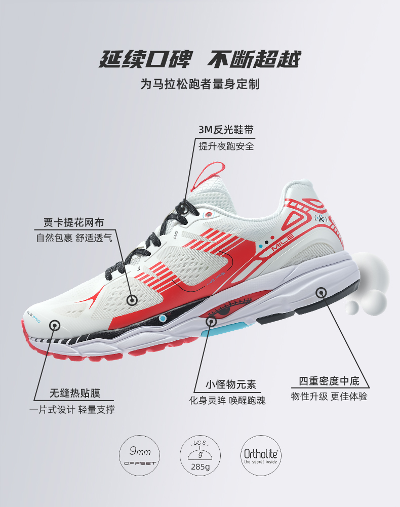同时鞋面上还覆盖有专属全马反光银标识,既能增加夜跑的安全性,还能很好的稳固鞋面不变形,也能彰显跑马拉松的么魅力与精神(特点就是帅)。