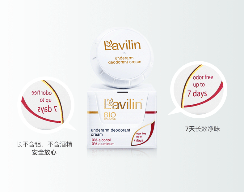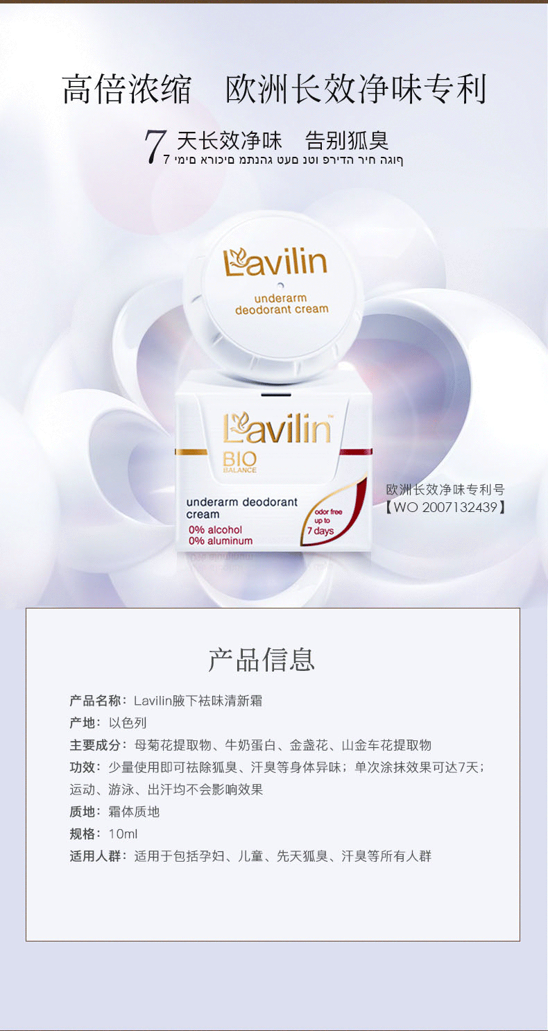 这款Lavilin高浓缩祛狐臭腋臭霜,以色列原装进口,拥有欧洲长效净味专利配方,少量涂抹即可祛除狐臭、汗臭等身体异味,单次涂抹效果可达7天,运动、游泳、出汗均不会影响效果;