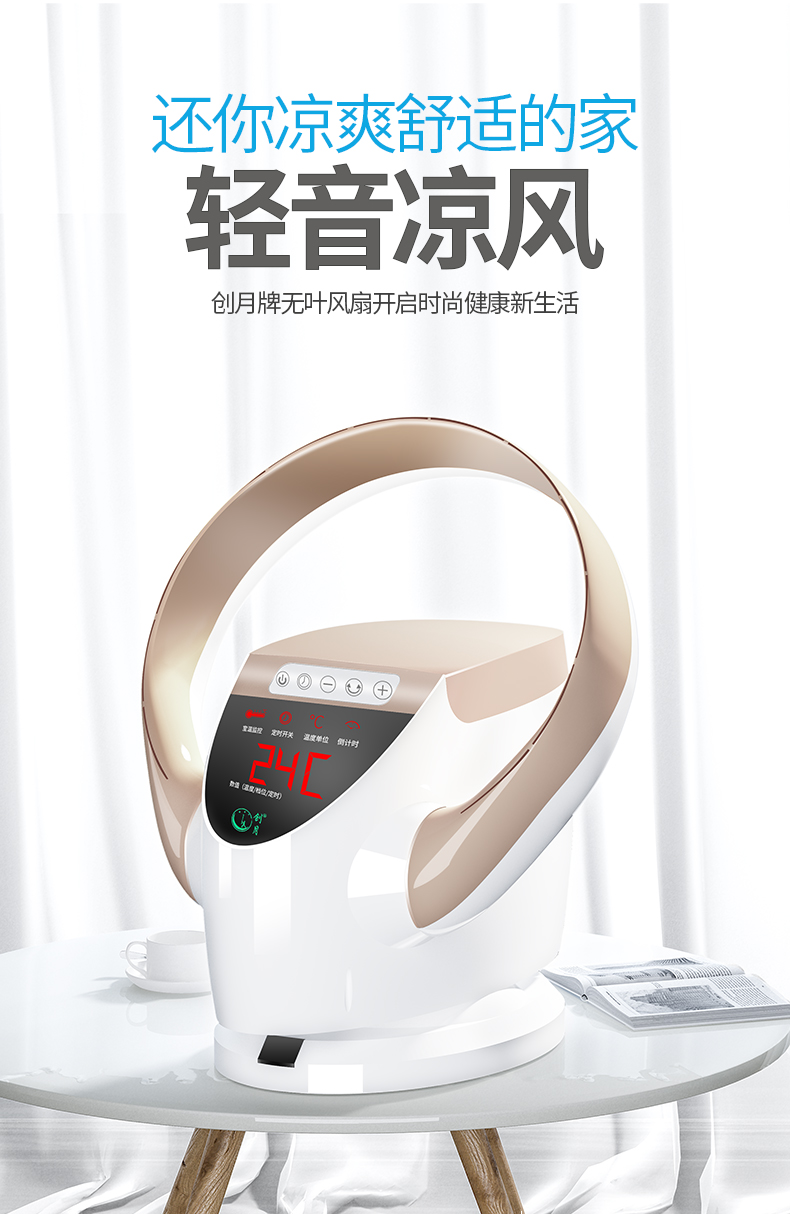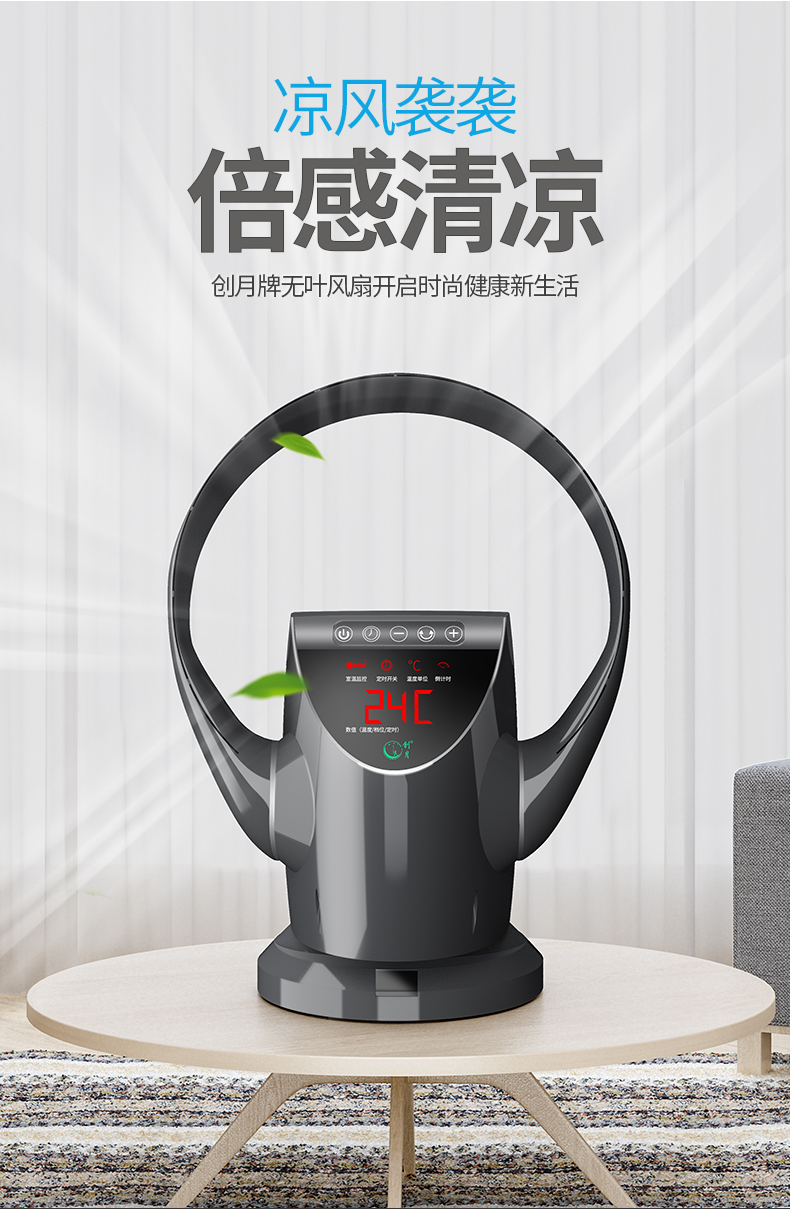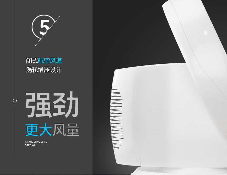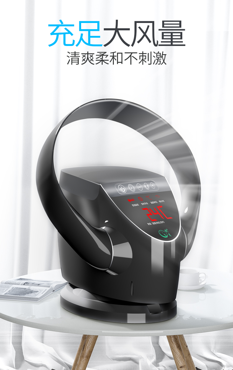 由底部无刷式马达吸入空气,并采用涡轮增压原理与喷气式飞机引擎技术优化风道设计,形成360°环形立体自然风,加上闭式航空风道设计,风力更强劲,充足大风量,清爽柔和不刺激。