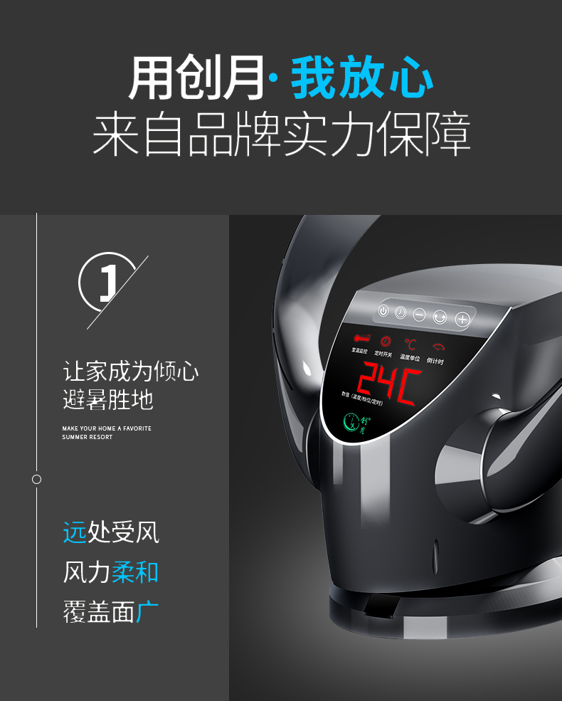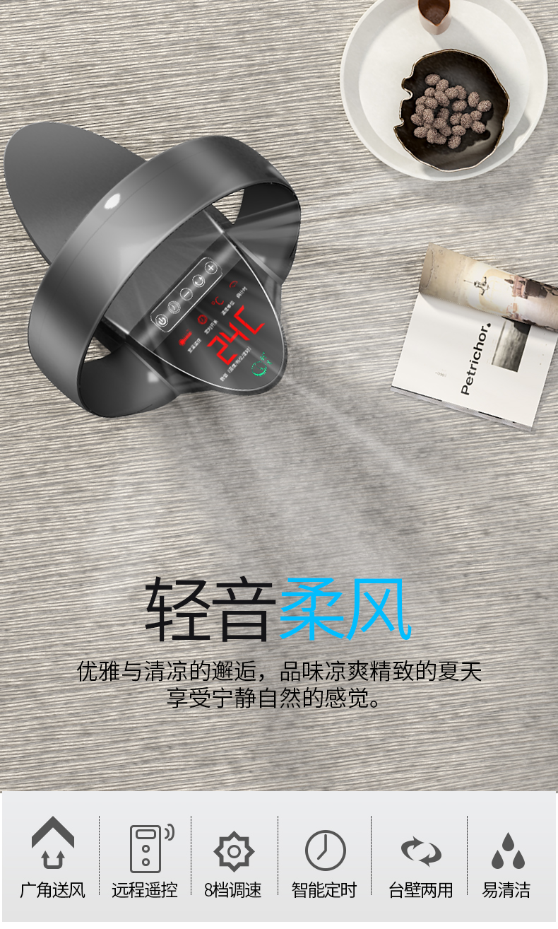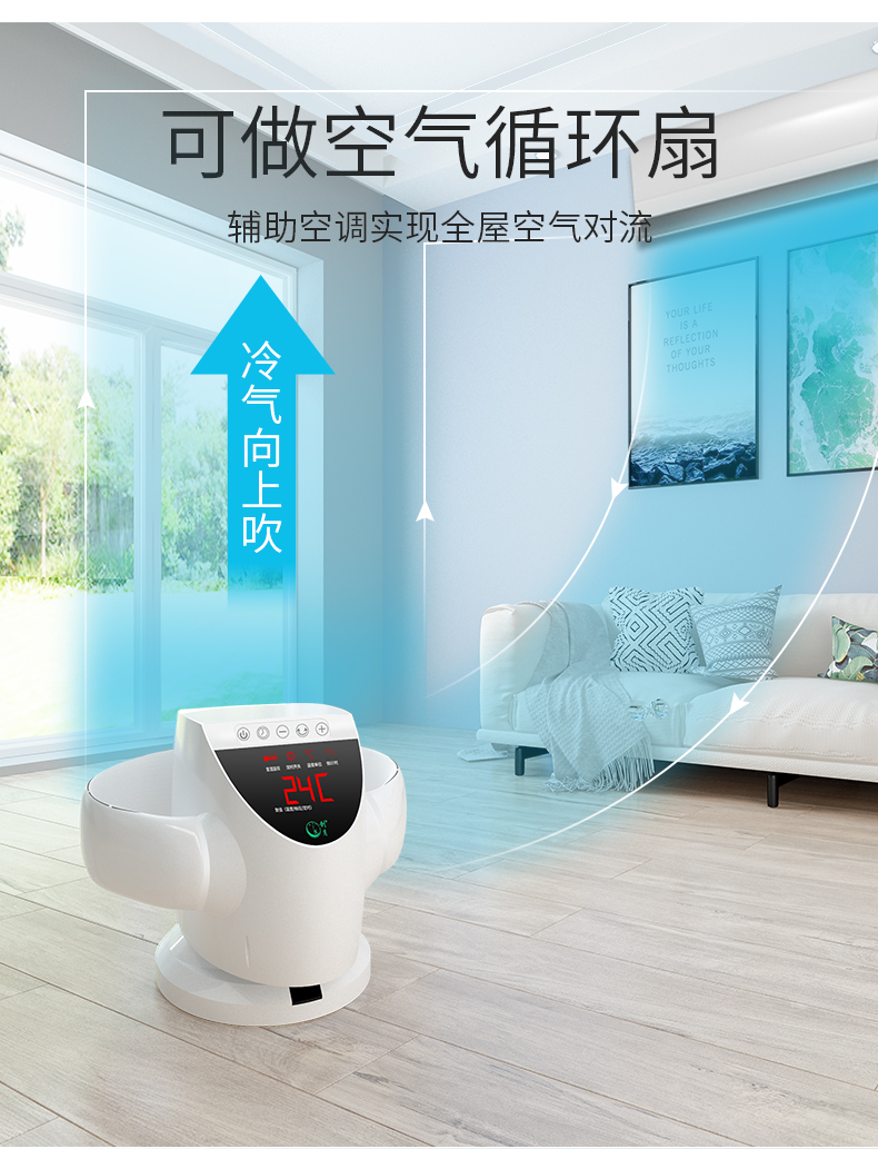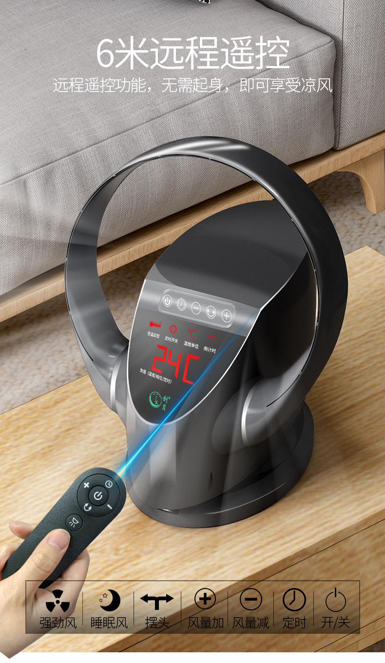 由底部无刷式马达吸入空气,并采用涡轮增压原理与喷气式飞机引擎技术优化风道设计,形成360°环形立体自然风,加上闭式航空风道设计,风力更强劲,充足大风量,清爽柔和不刺激。
