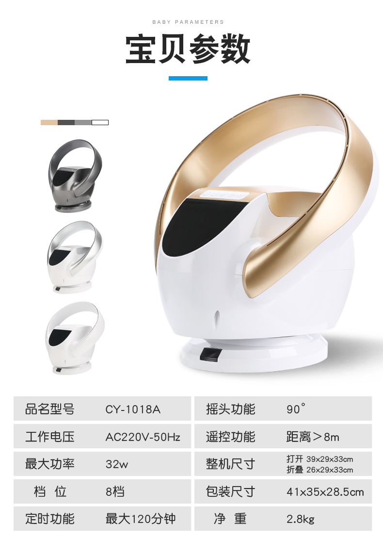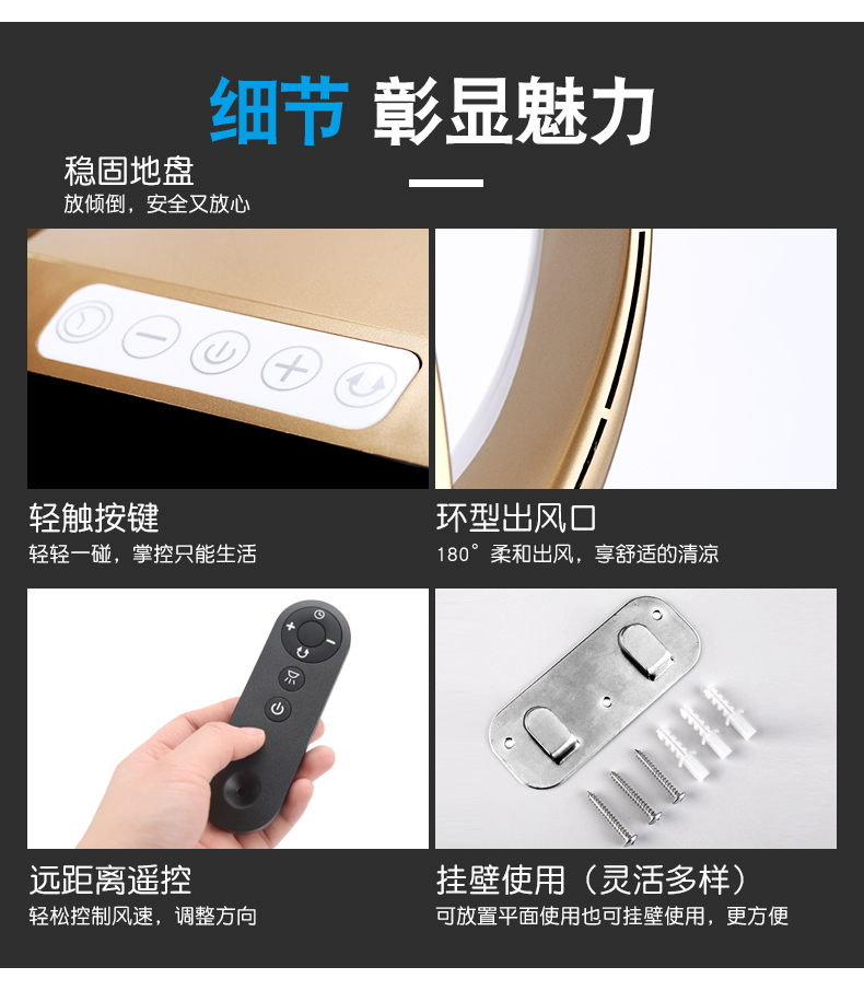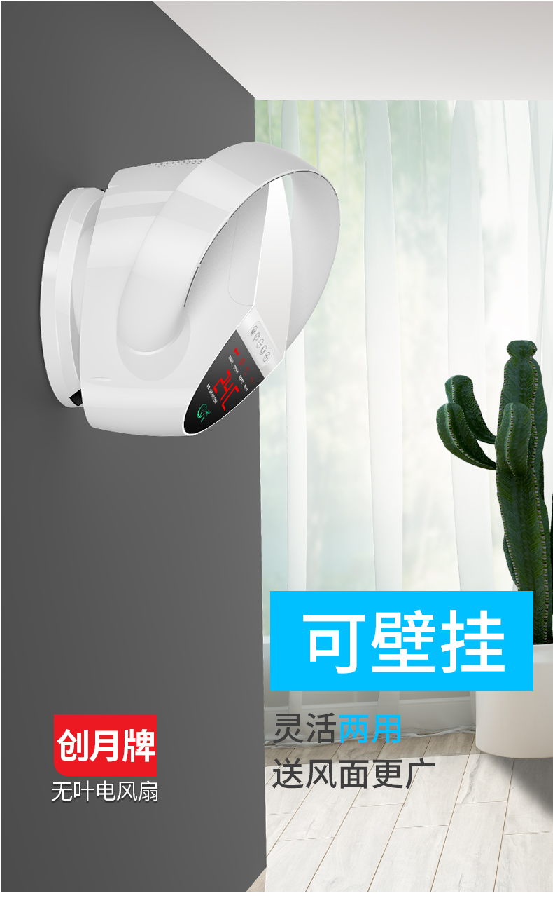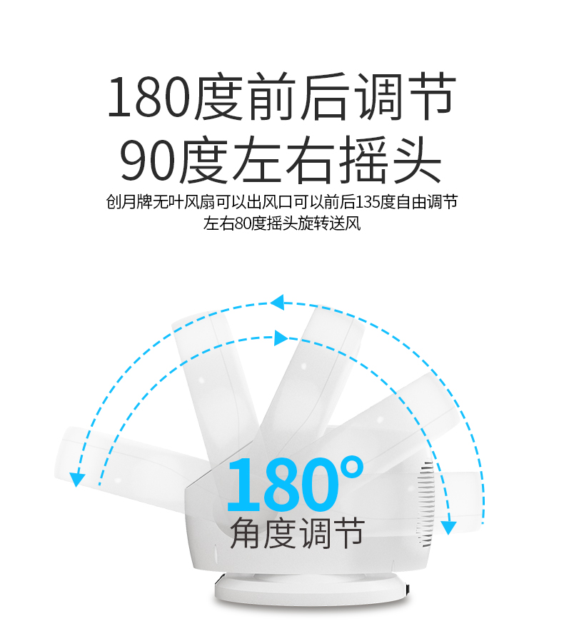这款胤帆静音无叶电风扇,可台壁两用,出风口可前后180度摇头、左右90度摇头,多角度送风,放平后,可作为循环扇使用。