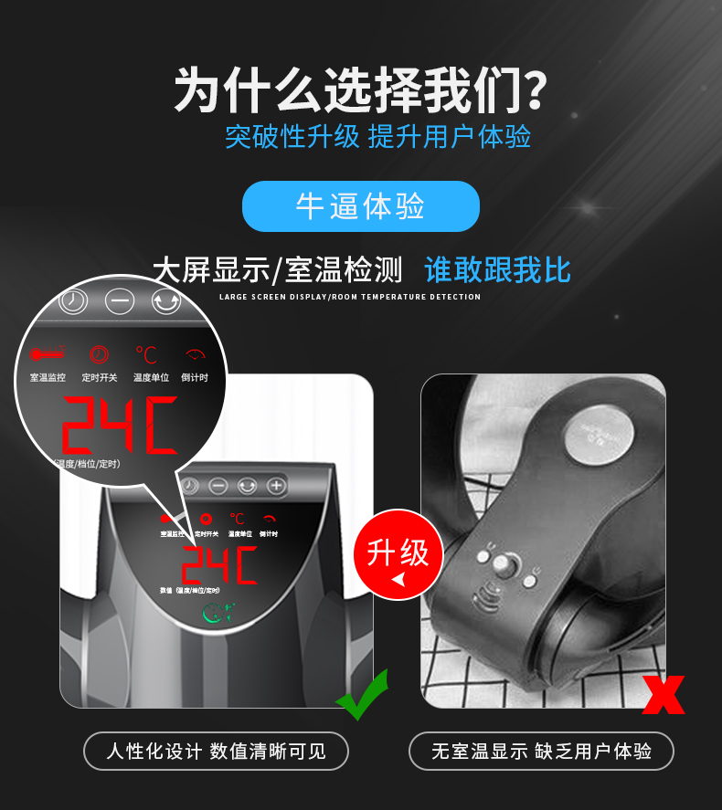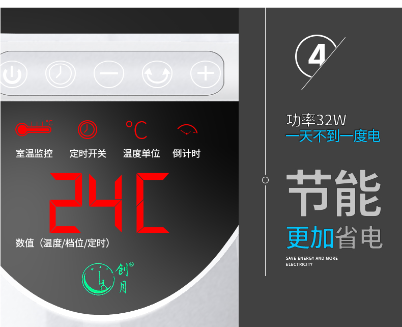 自带大屏幕,会自动显示室内温度,功率32W,使用一天不到一度电,最远6m远程遥控。