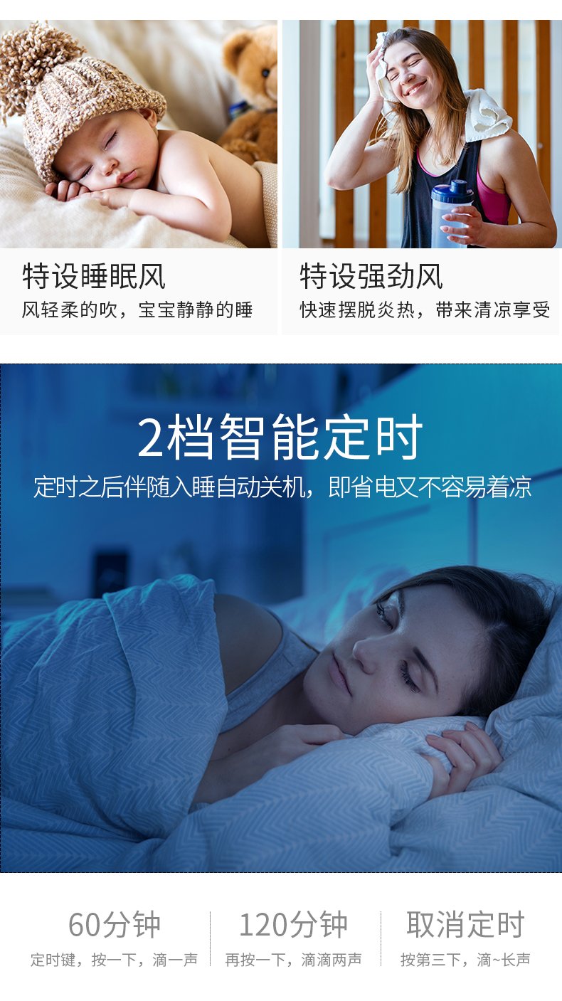 2档智能定时,定时之后伴随入睡自动关机,既省电又不容易着凉;