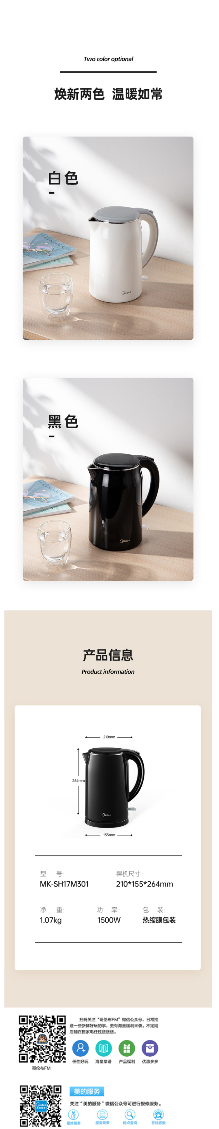 这款美的MK-SH17M301电热水壶,采用的就是304食用级不锈钢内胆,安全健康。