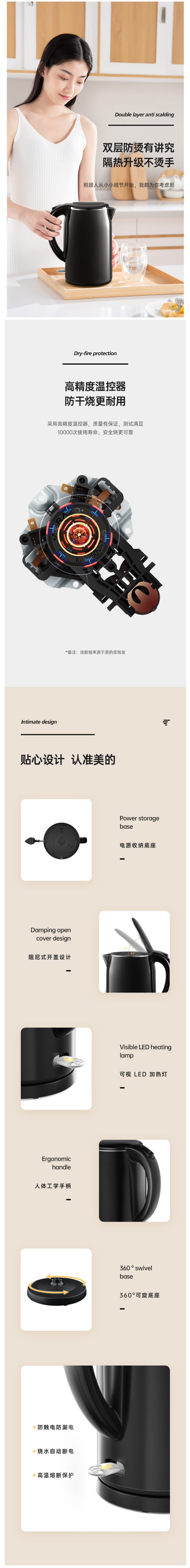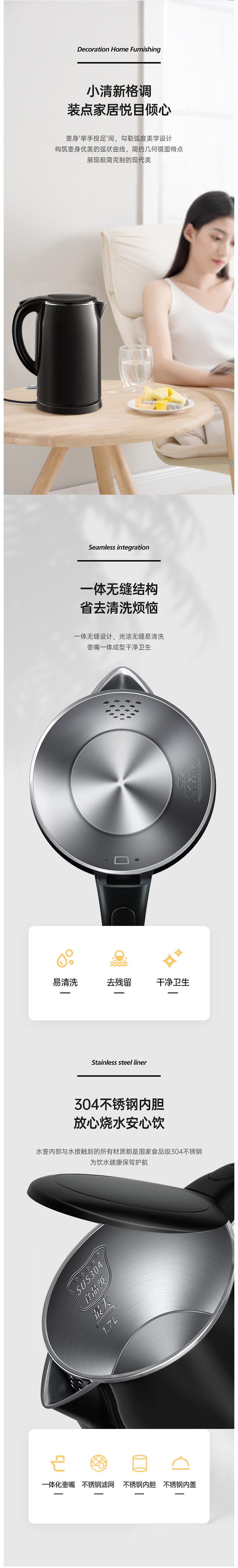 1500W大功率,烧水快;全新耀石色,细腻的磨砂手感,颜值高;壶体是三层设计,内外双层壶身,即使烧开水,触摸也不会烫手;外层,耐高温的钢琴烤漆PP材质;中间层,中空隔热不烫手;内层,304不锈钢;