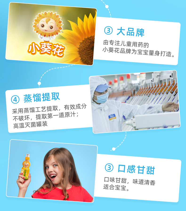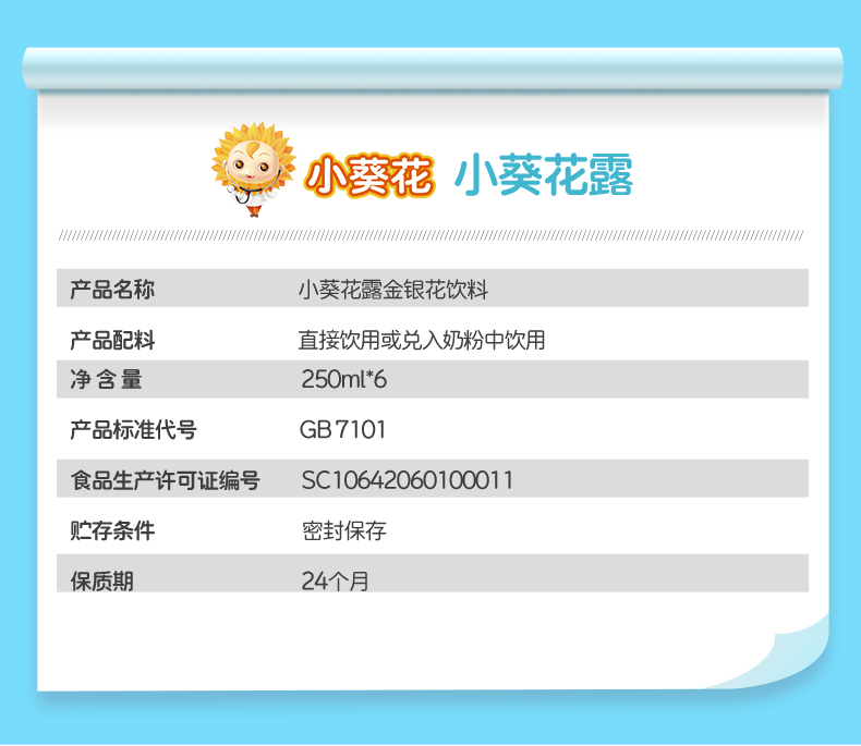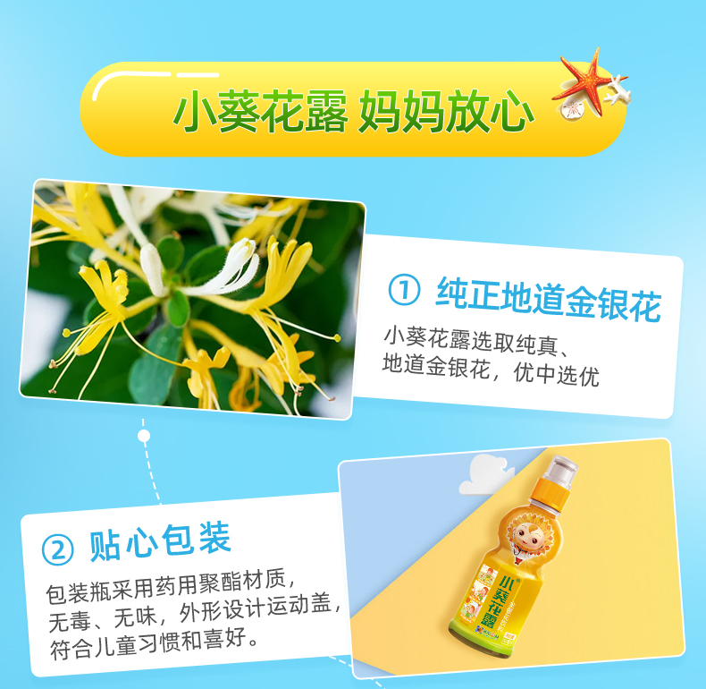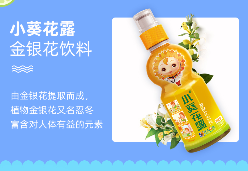 这款葵花药业 小葵花露金银花露 ,规格:250ml*6瓶,选用真金银花制饮,不用山银花替代,采用高温灭菌技术,恒温蒸馏,有效成分完好保留,口味甘甜,清香四溢,适合儿童味蕾;瓶嘴设计充分考虑孩子吸吮方式,采用进口抽拉瓶盖,类同奶嘴的吸吮,防止呛到,流畅不松垮,增添乐趣的同时保证卫生。