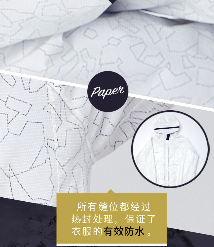 Amurcamp纸感冲锋衣,把冲锋衣的功能做到风衣的重量,使用新颖的纸感面料,轻薄程度接近于纸,230克重量不到传统冲锋衣的一半,防水指数10000mm可防暴雨,直接当雨衣穿。透气指数高达10000g激烈运动可穿,还拥有UPF 50+的50倍防晒功能。