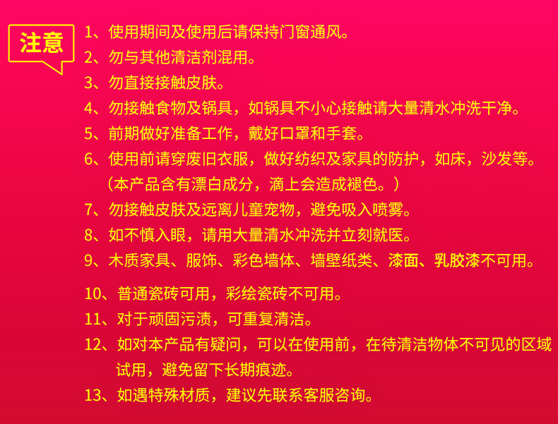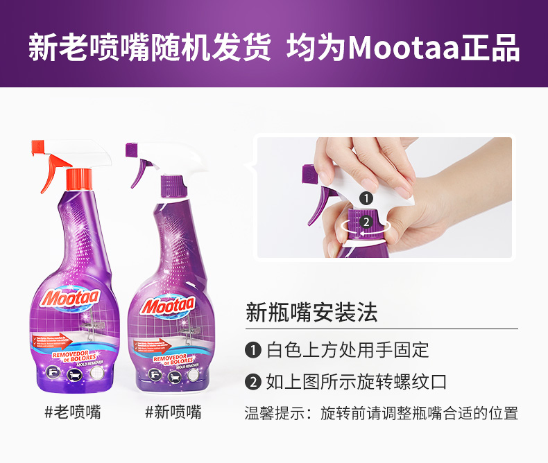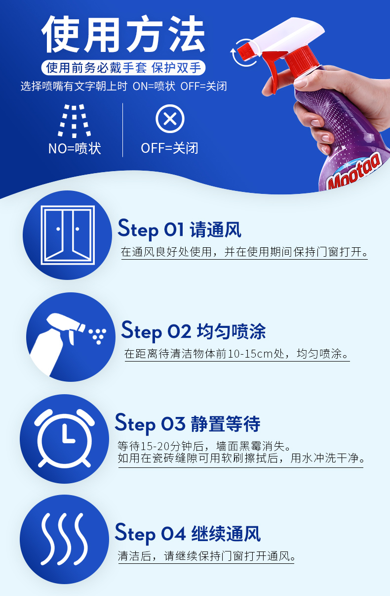 使用方法,首先开窗通风(稍微有点刺激性气味,跟消毒水差不多),然后喷洒于霉菌处,停留2-3分钟后,用抹布擦净即可。