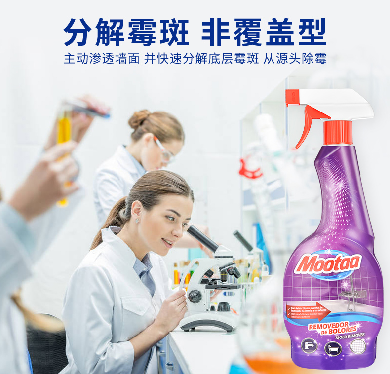 主要是对发霉变色的区域进行有效氧化漂白,将有机色质内部“生色团”破坏掉,以达到除霉的效果;除霉剂溶液会渗透进墙面1-3毫米,其有效成分会长时间阻止霉菌再生,就有长效防霉效果;