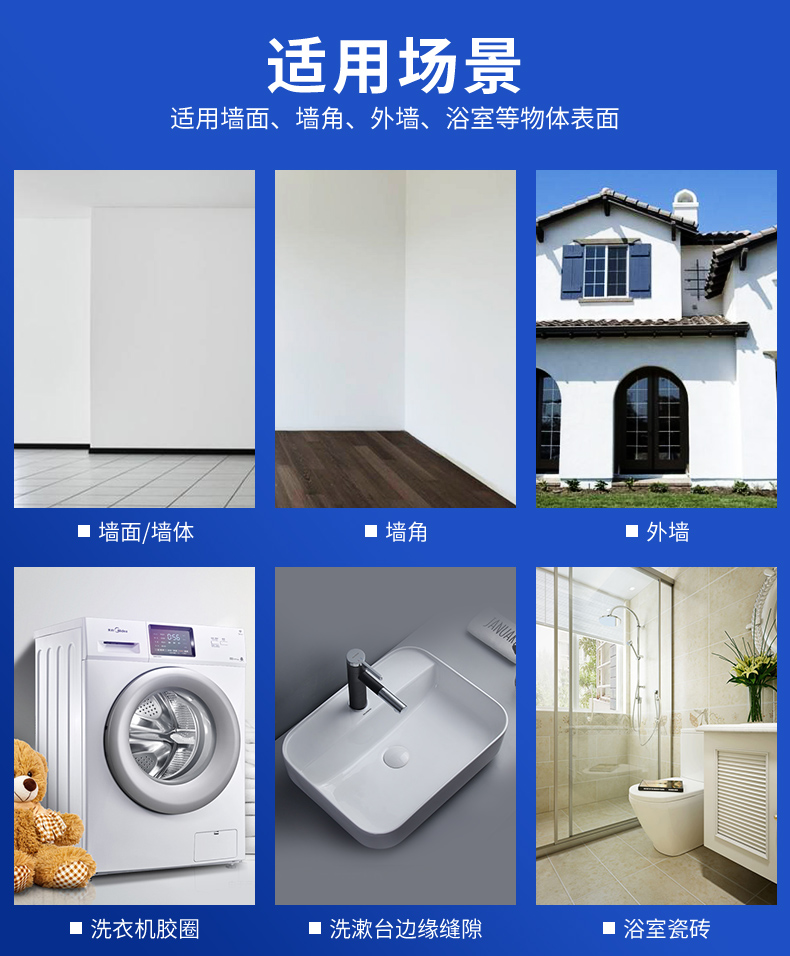 适用于墙面/墙体/墙角、洗衣机密封橡胶圈、瓷砖缝隙、马桶底部缝隙、洗漱台缝隙、洗碗池缝隙,不含重金属,安全健康。