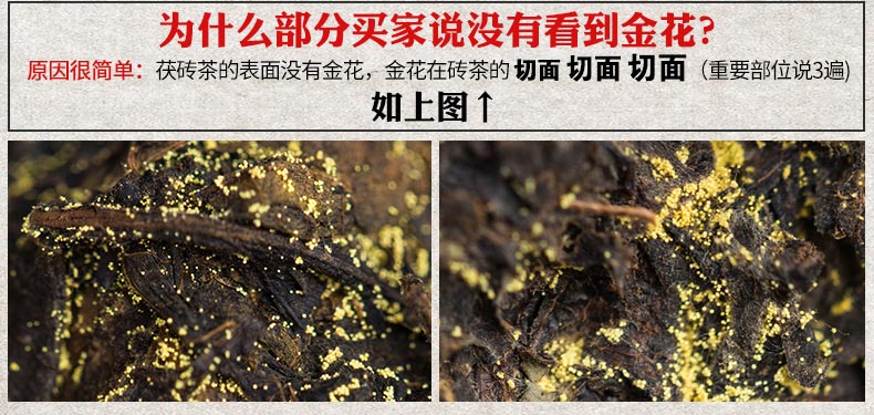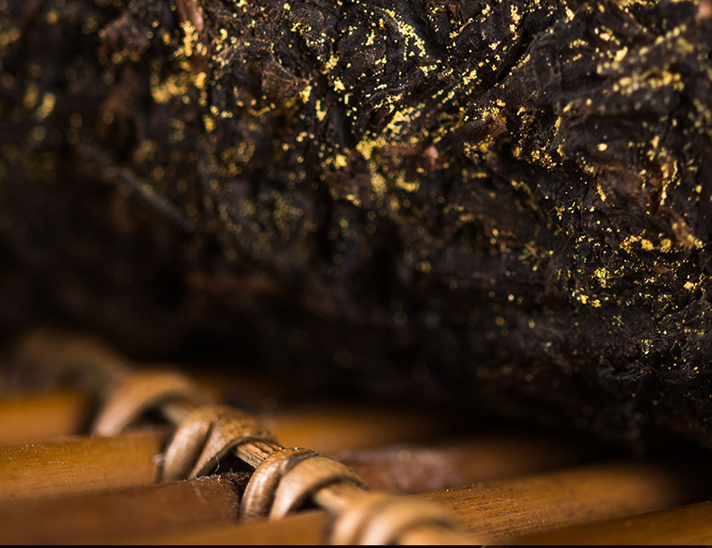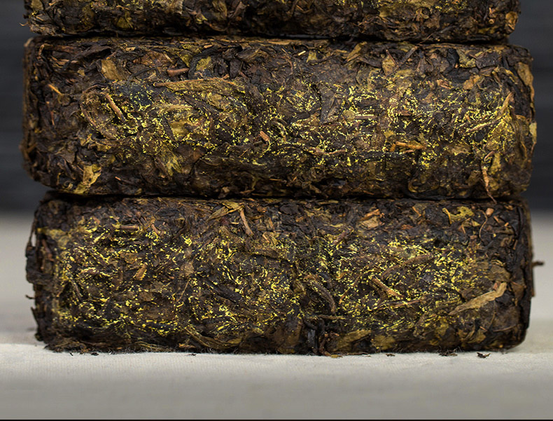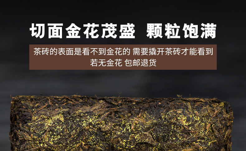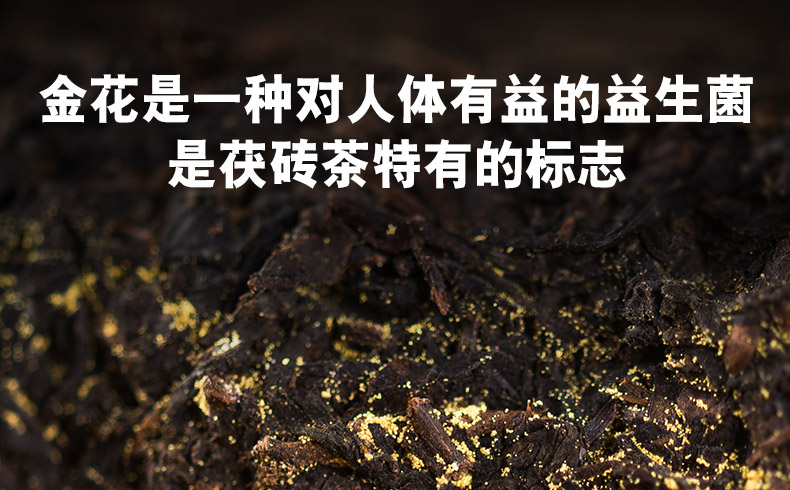 茯砖茶内的“金花”自然发酵生成,学名称为“冠突散囊菌”,内含多种氨基酸和丰富的营养元素,金花越茂盛,则品质越佳,干嗅有黄花清香,日常饮用具有一定的保健作用。