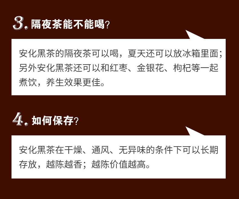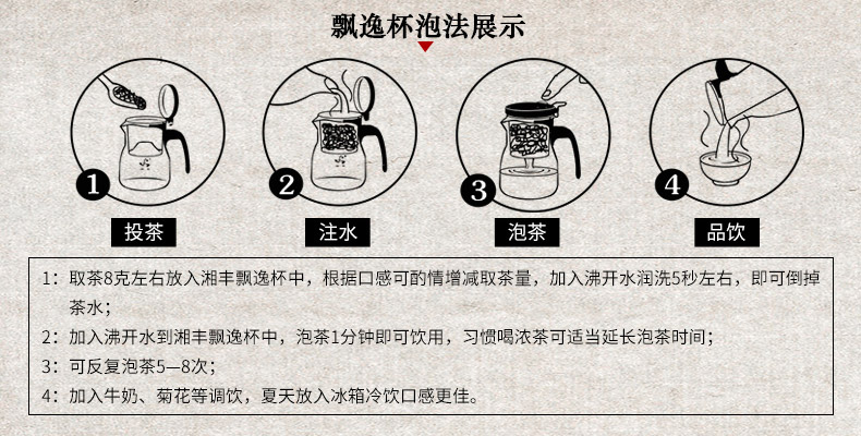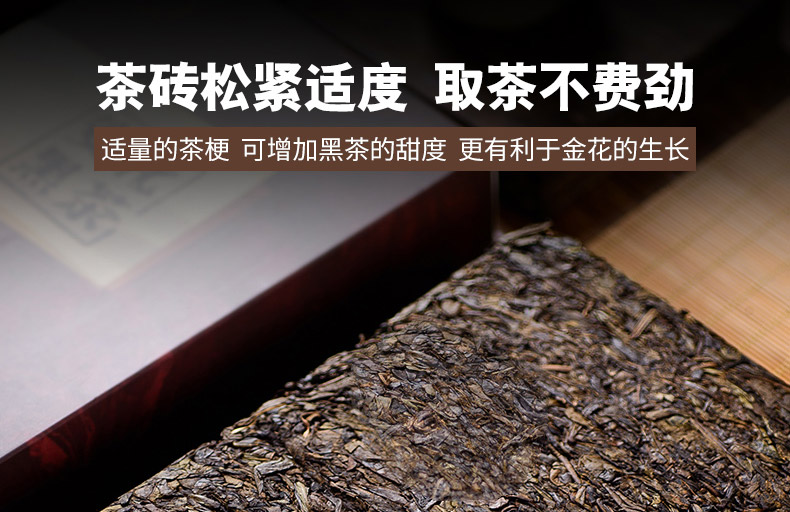 这款金花茯茶,由茯砖茶撬散而来,以安化黑毛茶为原料,传统工艺纯手工工艺恒温发酵,干茶乌黑温润,金花饱满茂盛,汤色红浓油亮,滋味醇厚绵滑、回味甘甜。