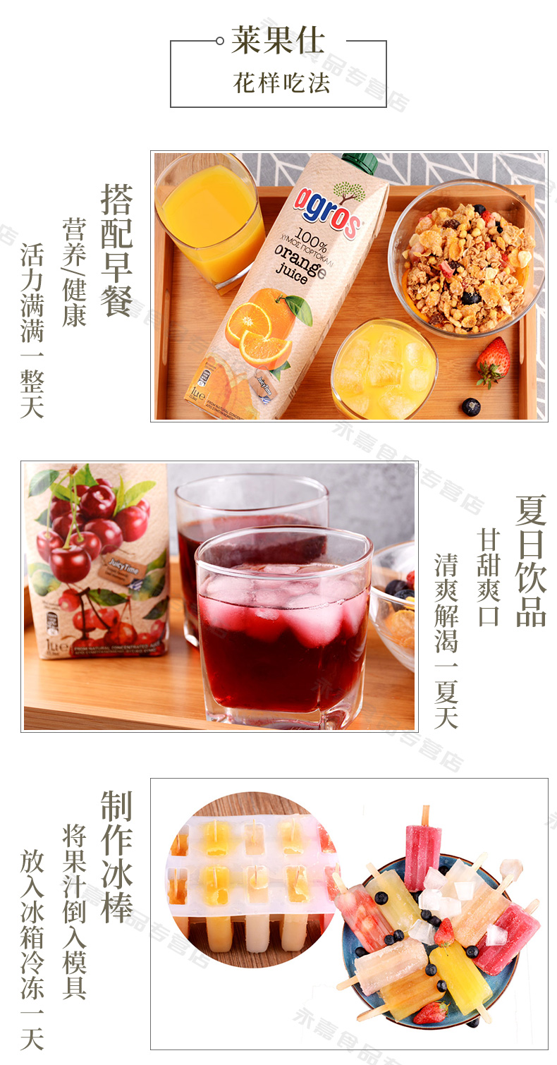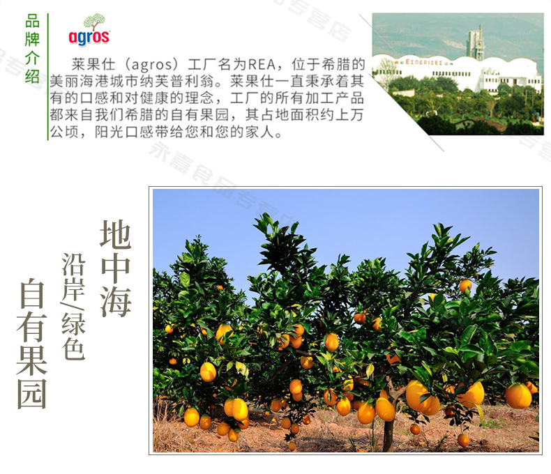 agros莱果仕工厂位于希腊的海港城市纳芙普利翁。一直秉承着其有的口感和对健康的理念,工厂的所有加工产品希腊的自有果园,选用当季新鲜水果,经过人工采摘筛选,新鲜榨取,有蔓越莓、菠萝、血橙、香蕉、桃、石榴、酸櫻桃、苹果、橙味共9种口味,可下单备注选购。