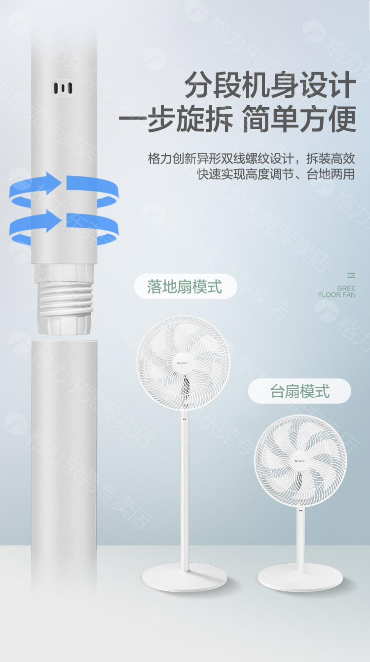 叶片采用多凹面的羽翼设计,糅合不同的切风角度,还原自然风的柔和与清凉拥有手动俯仰30°调节,左右80°广角送风,分段机身设计,双线螺纹链接,随时调整高矮,台立两用,使用方便。