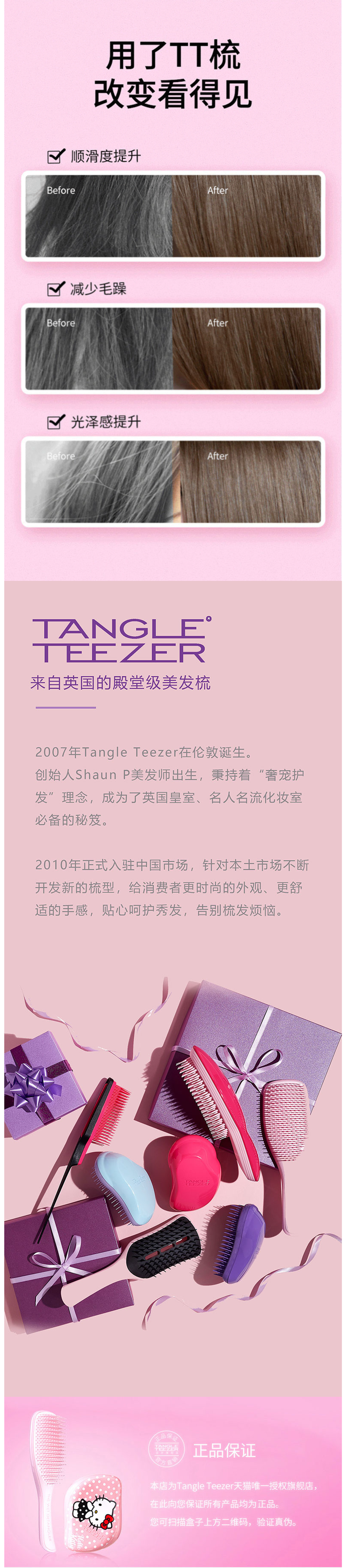 Tangle Teezer美发梳是来自英国的专业美发梳,其设计理念源于英国时尚美发界知名发型师Shaun P,是专为解决纠缠打结的新一代专业护发产品,就连凯特王妃也是TT美发梳的忠实使用者。