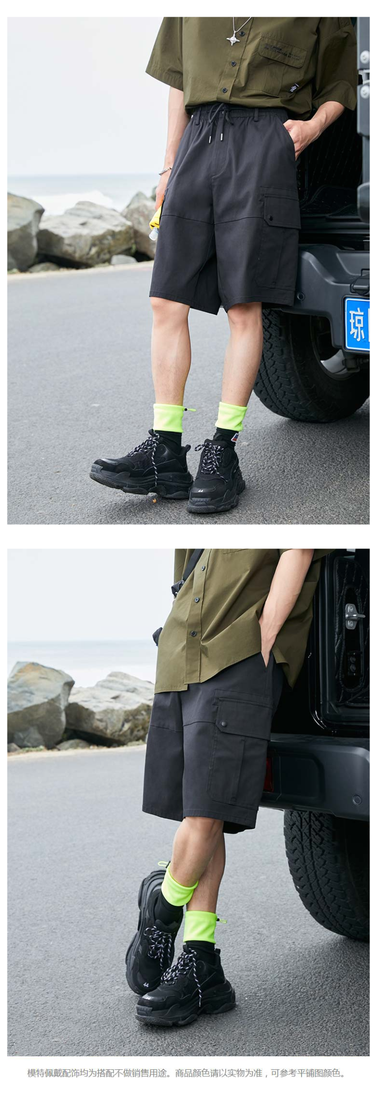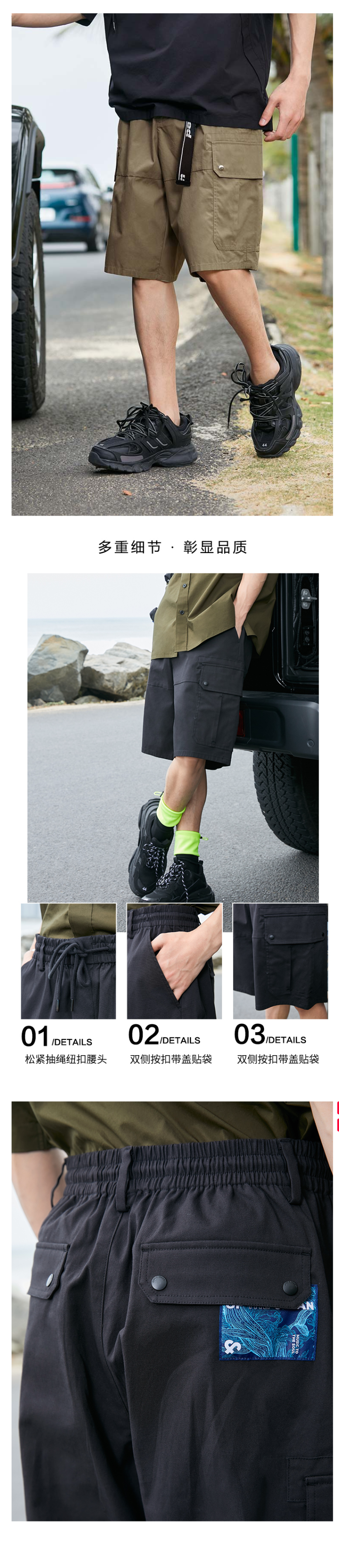 在款式上,宽松直筒版型,工装休闲风,共有6个口袋,弹力松紧裤腰搭配抽绳,穿脱方便,双腿侧按扣带盖贴,撞色logo标识。