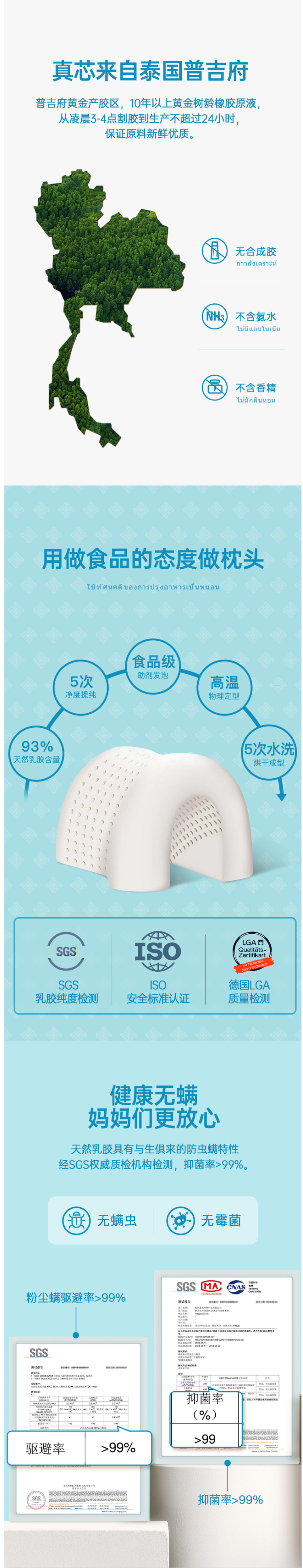 甄选普吉府黄金产胶区的天然乳胶原液为原料,无合成胶、不含氨水和香精。乳胶枕中的天然乳胶含量达95%,从原液经过5次精度提纯、食品级助剂发泡、高温物理定型、5次水洗烘干,最终制成。