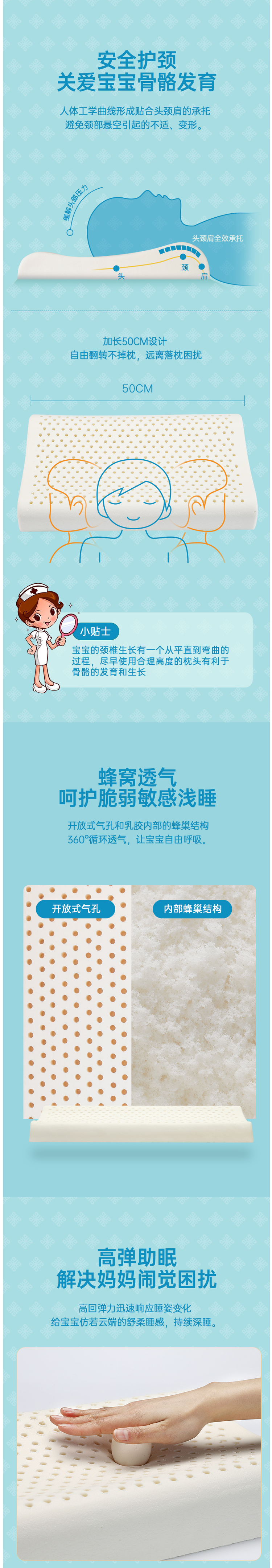开放式气孔和乳胶内部的蜂巢结构,使得枕芯自然通风,360°循环透气,散发人体热量和湿气;高回弹力能迅速响应睡姿变化,给宝宝都来仿若云端的舒适睡感,保证持续深睡。