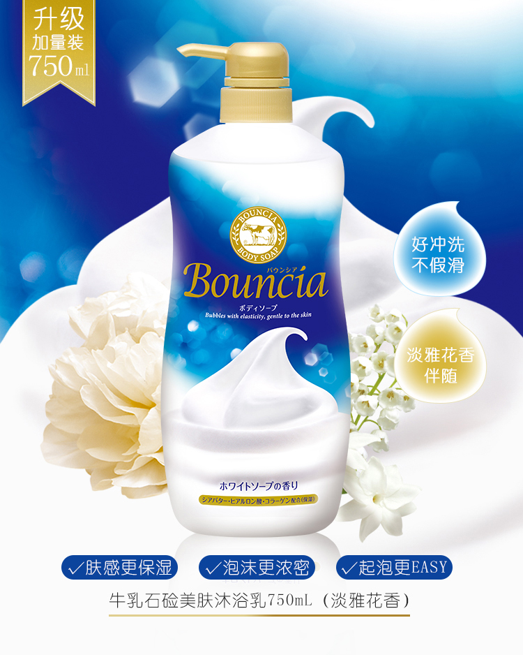 传说中一用就爱上的沐浴乳,不老仙妻水谷雅子护肤的心得秘籍,数次荣登日本Cosme大赏洗护NO.1的超人气产品,也是日亚销量第一的沐浴乳。承袭牛乳石碱百年独特釜顶制法,采用植物性石碱素材,成分天然温和,添加了三种美肤成分:胶原蛋白、尿玻酸、牛奶蛋白,深层滋润肌肤,保持沐浴后的肌肤光滑柔嫩。添加牛乳精华与胶原蛋白及透明质酸,能滋润嫰白肌肤并可清除毛细孔内的污垢与角质,使肌肤晶莹剔透,含有甘草保湿成份,洗后不干涩紧绷,不黏腻好冲洗。