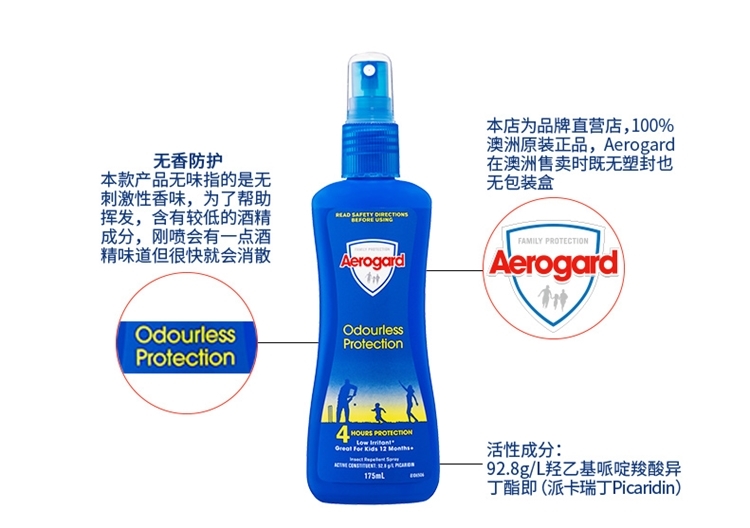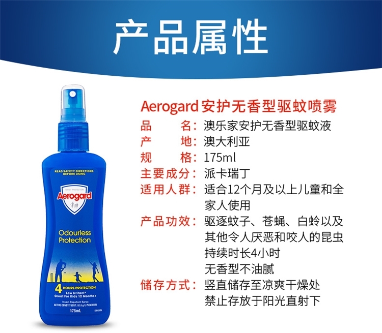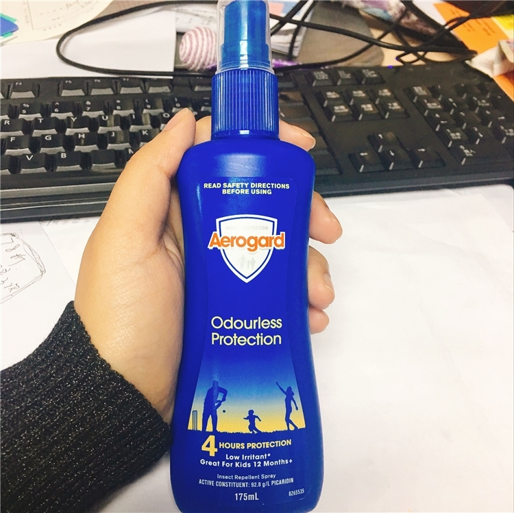 这款Aerogard 儿童驱蚊水,澳洲原装进口,适合1岁以上儿童使用,使用前请先摇匀,在距离15-20cm处,可直接喷在暴露的皮肤上,使用10.3%埃卡瑞丁(派卡瑞丁)作为驱蚊成份,无味,不油腻,驱蚊效果4小时,对苍蝇、白蛉以及其他虫子同样有效。