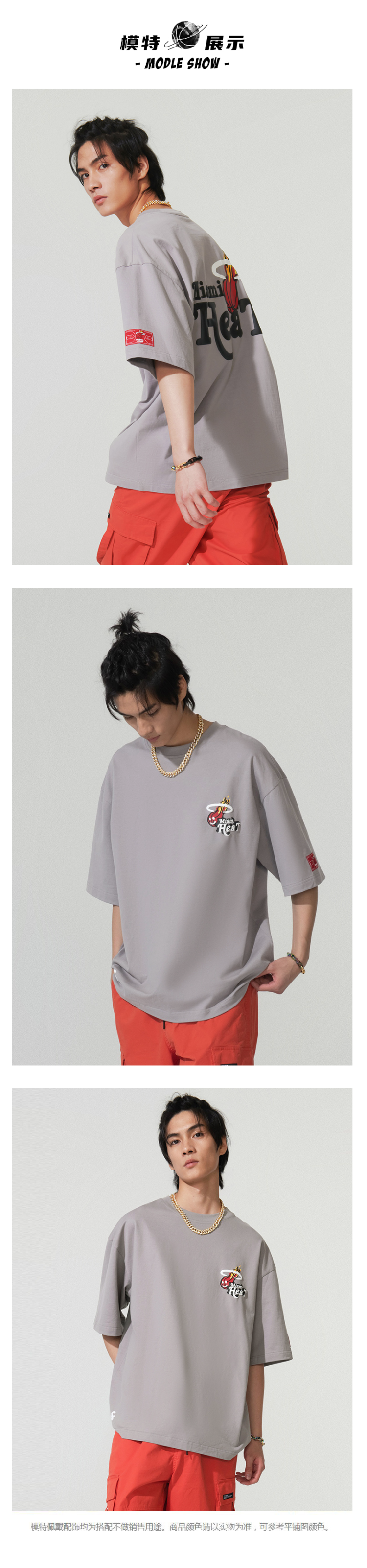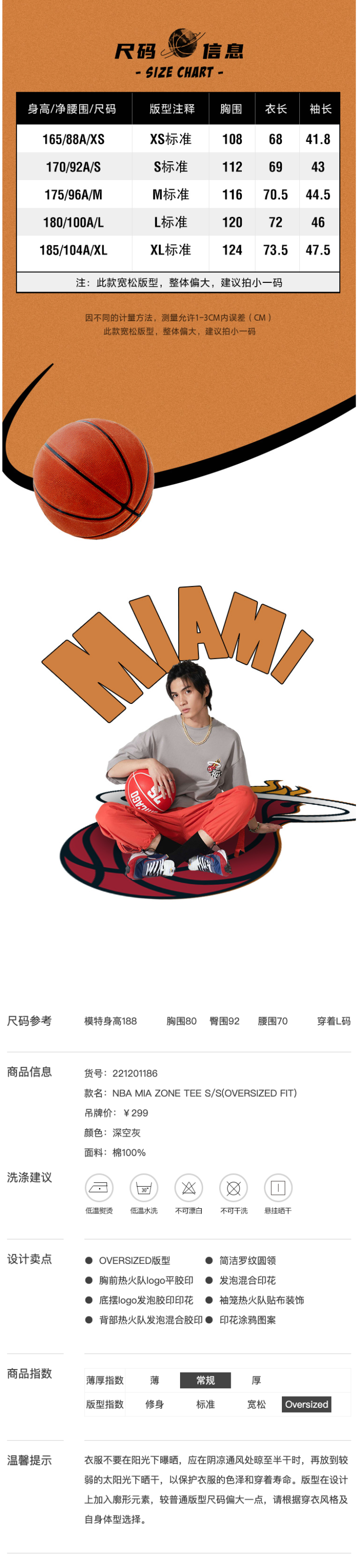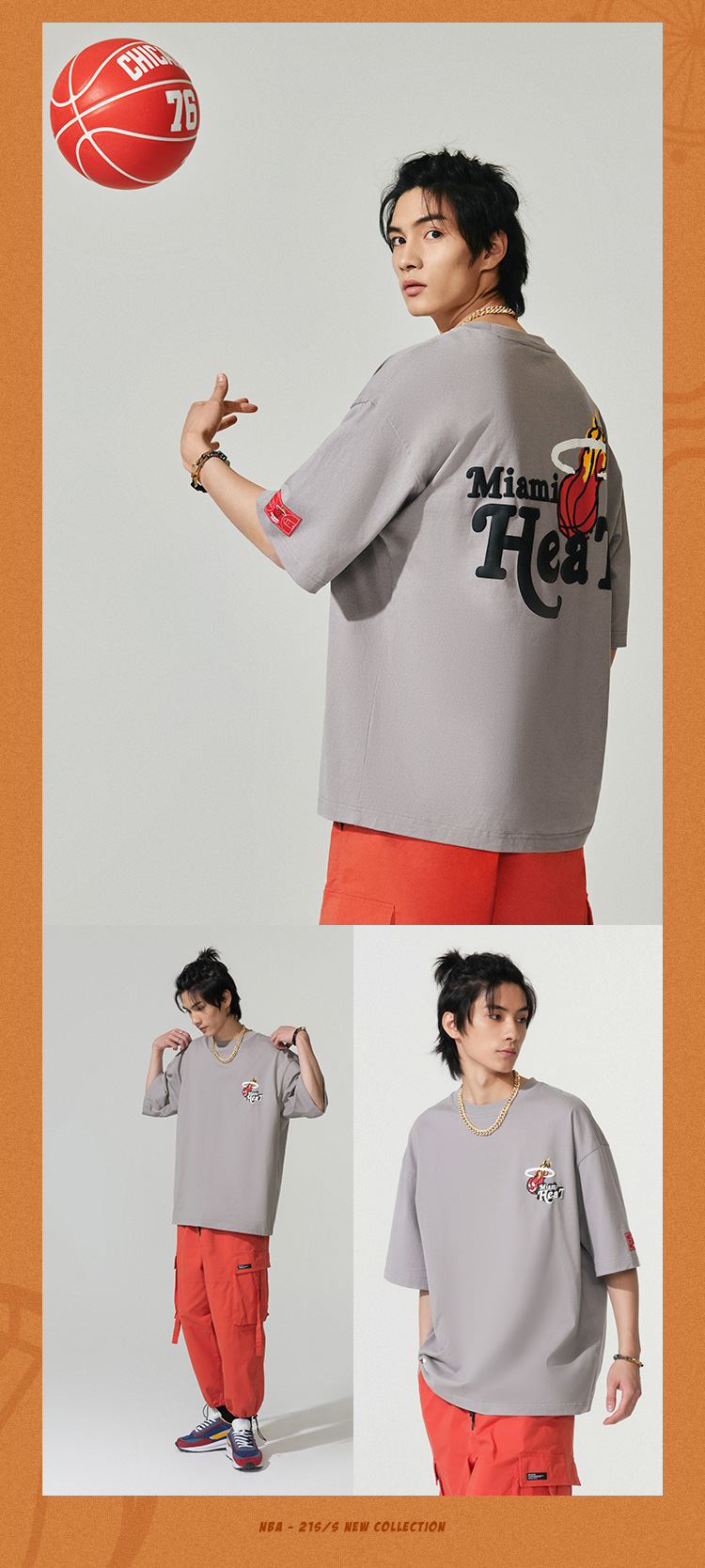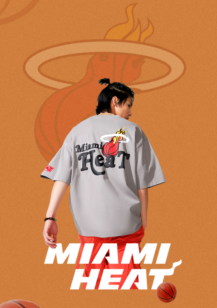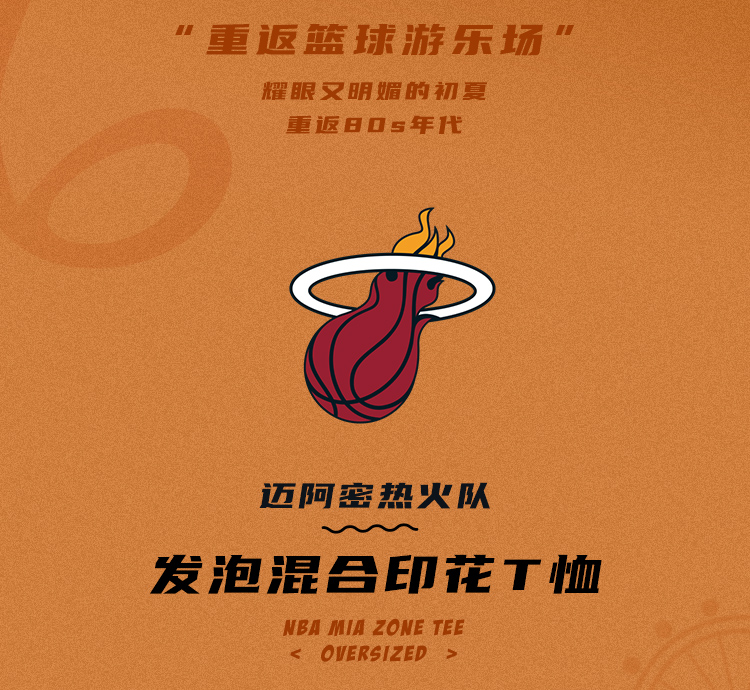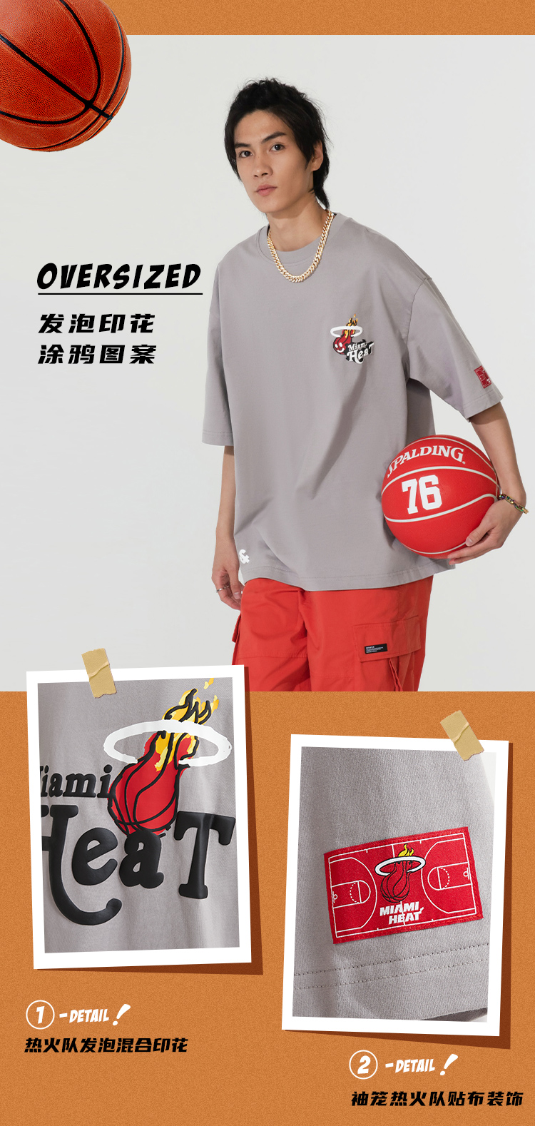 在款式上,Oversize版型/超宽松版型,完全不挑身材。胸前热火队logo平胶印、背部热火队发泡混合胶印、袖笼是热火队贴布装饰、底摆logo发泡胶印印花。