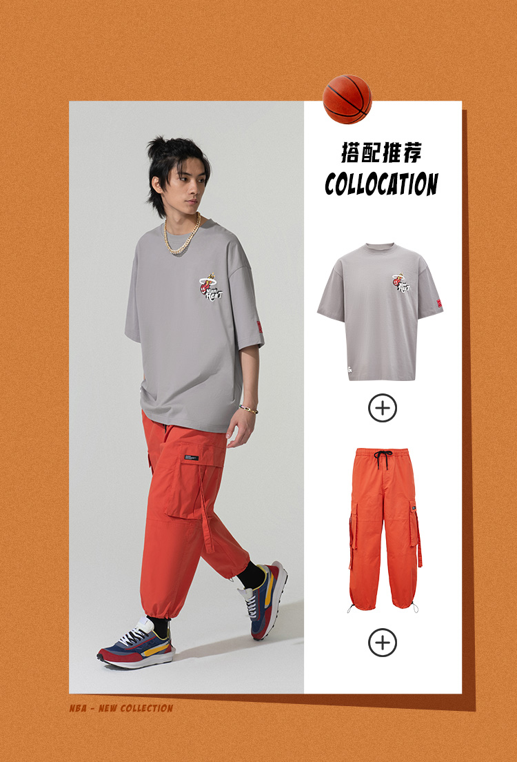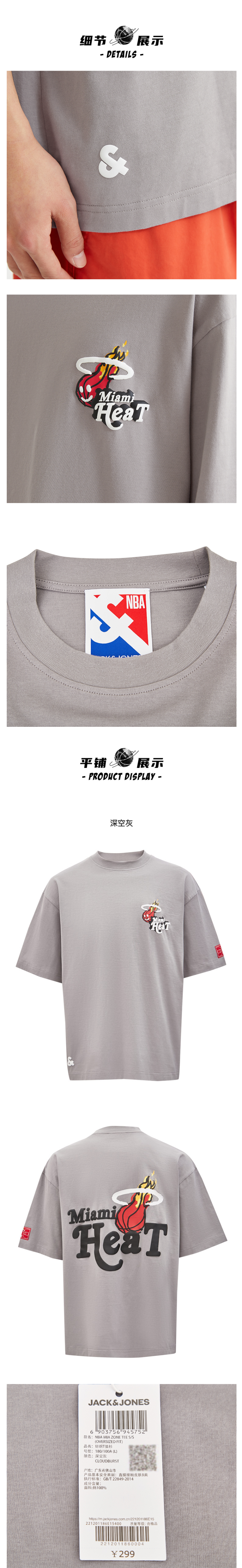 这款杰克琼斯男T恤,2021年的新款,和NBA联名发布, 衣身上有热火队Logo平胶印及发泡混合印花,篮球氛围十足。使用100%纯棉面料,手感柔软,吸湿吸汗。
