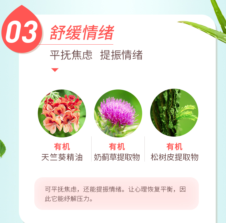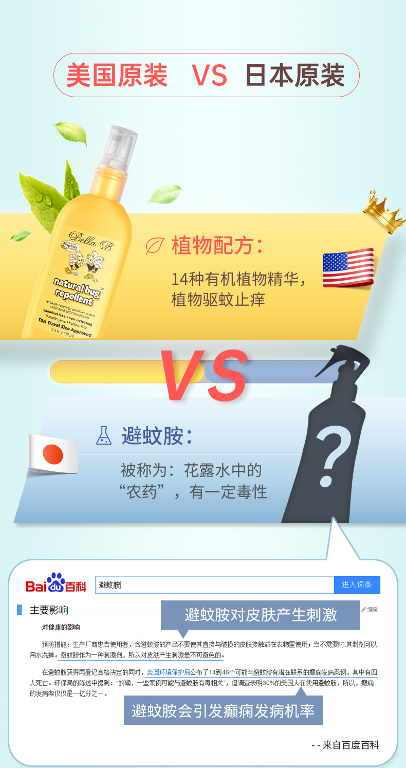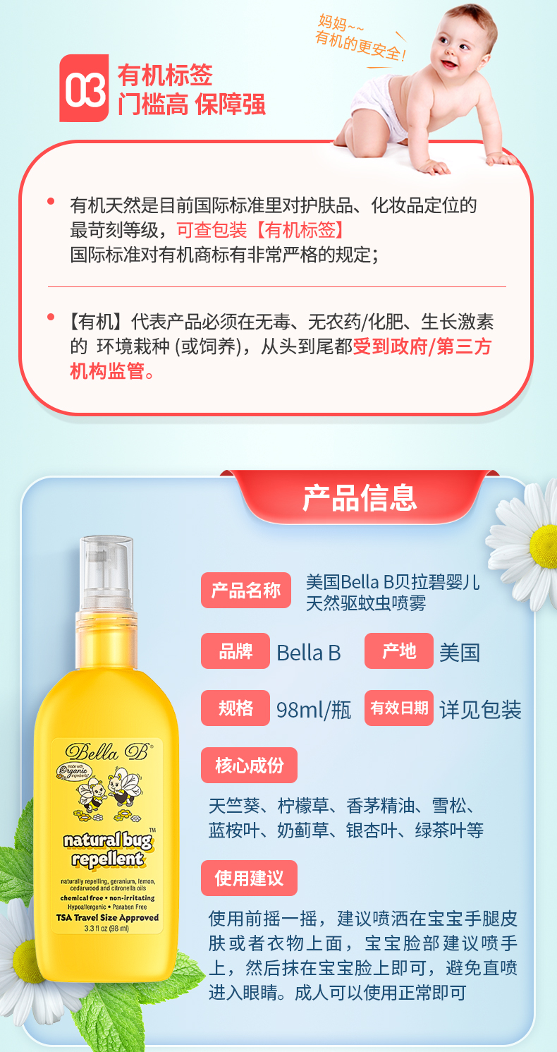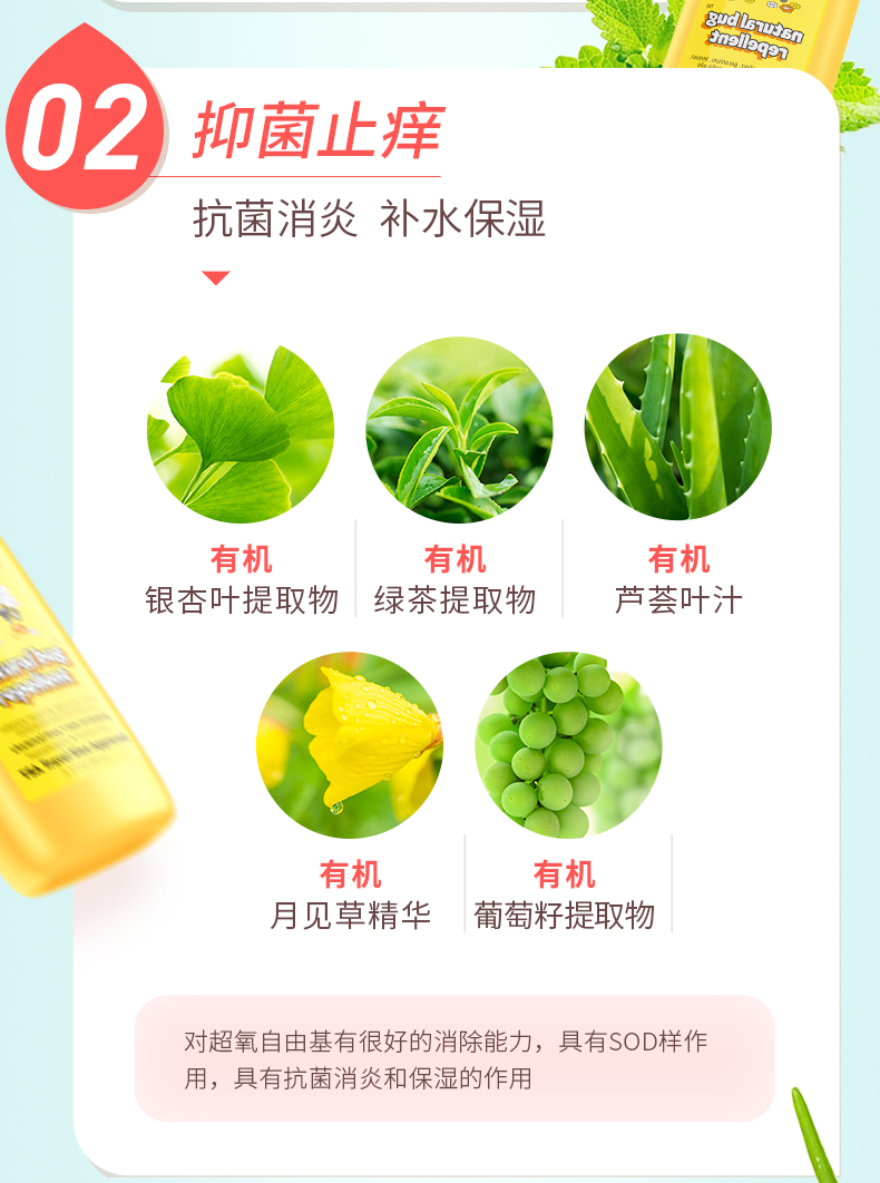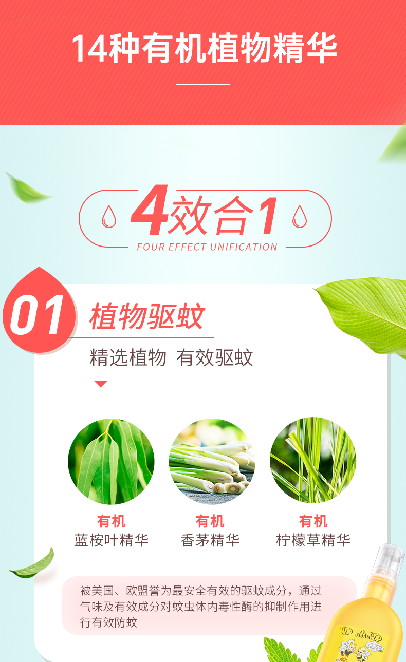 采用14种天然有植物精华,不含任何化学成分,尤其是驱蚊胺、驱蚊酯,纯粹是运用自然仿生学原理来达到驱蚊的效果。在自然界中,有诸多类似天竺葵、香茅草这些具备驱蚊能力的植物,提取并模拟这些植物的气味,可以达到天然驱蚊的功效;