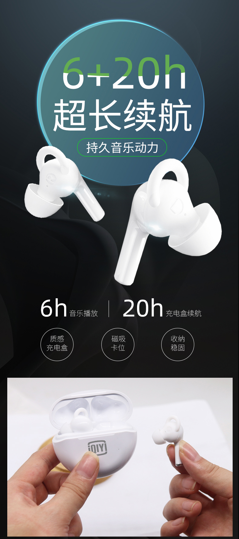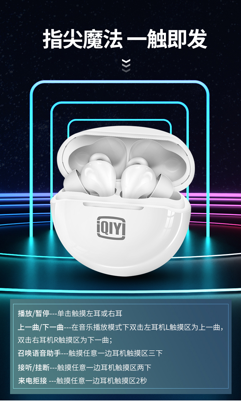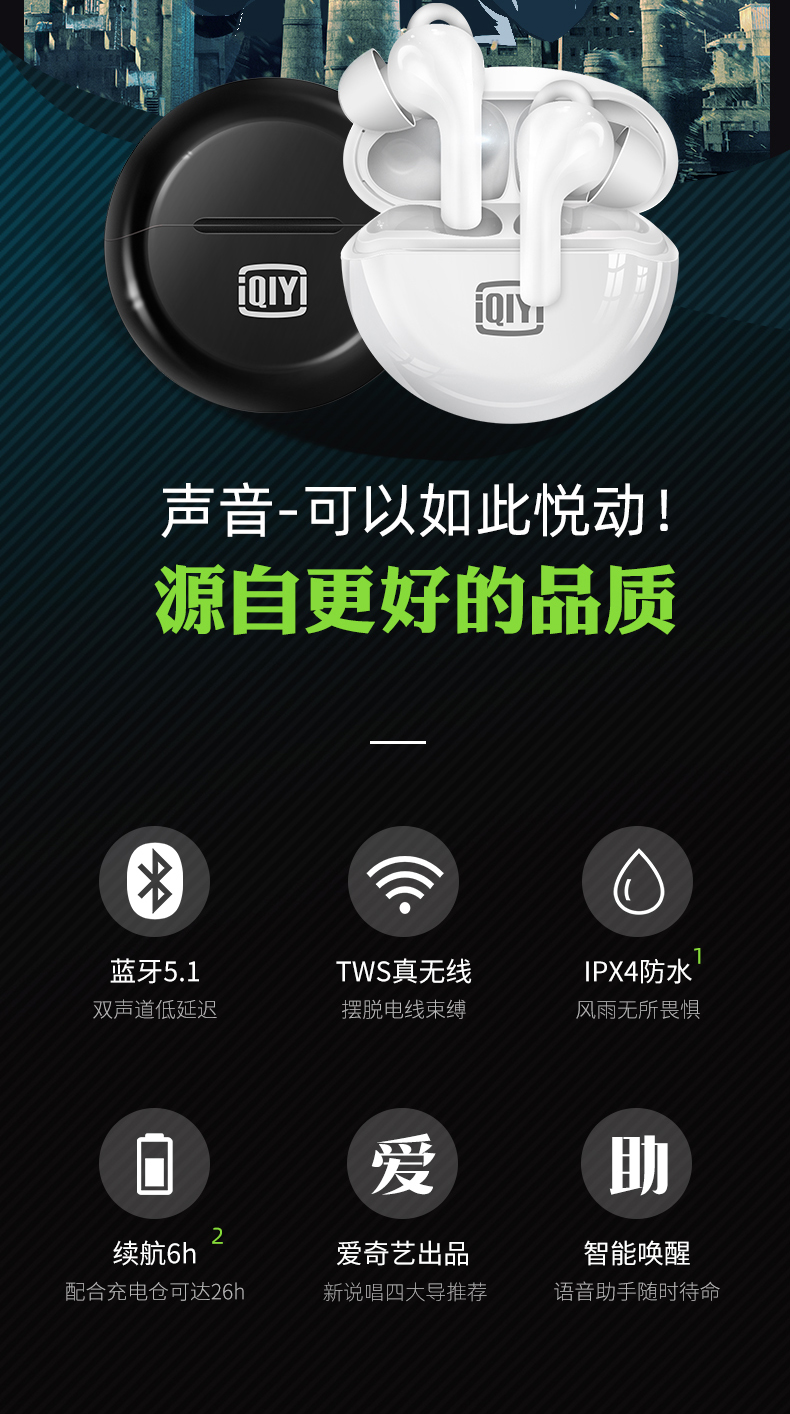 爱奇艺倾情调音,三频均衡,声音自然,具有清晰的声音和通话体验,内置蓝牙5.1芯片,双声道设计,长连接距离、低延迟,还有开机自动连接的功能,搭配充电仓最长能够实现26小时长续航,使用方便。