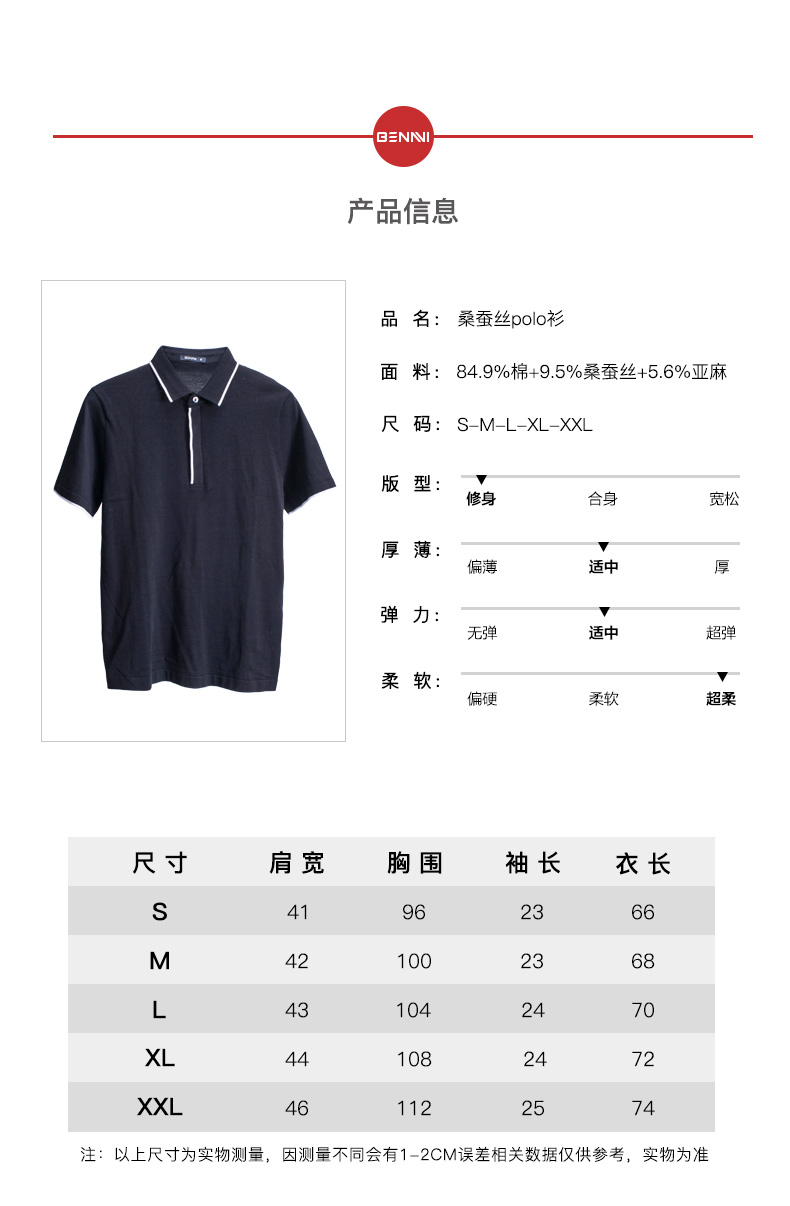 此款男士polo衫为本米刚推出的新品,主要原因就是,在面料成本上比别的款式高出许多,面料以84.9%棉为基底,混入5.8%的亚麻,以及9.5%的重磅桑蚕丝,这种多成分混合的面料,通过合理调整成分的配比,往往能获得各成分的长处,使面料美观度、耐久度、舒适度都达到最佳。
