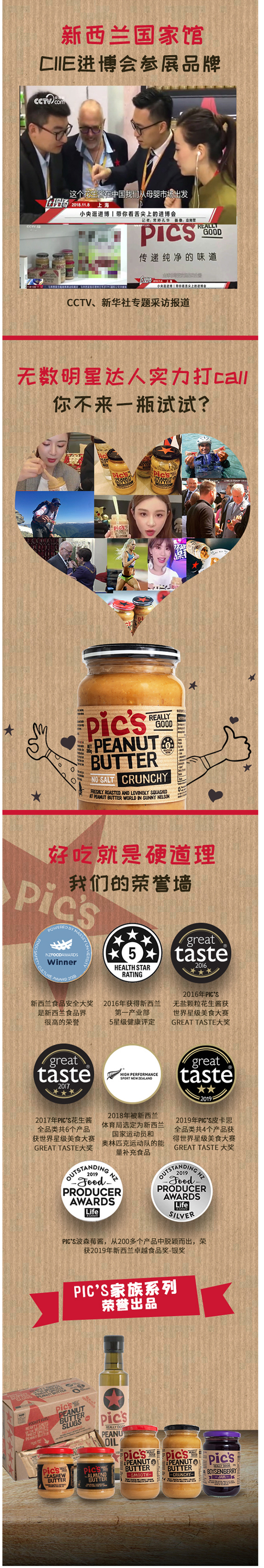 Pics的花生酱是新西兰国宝级的花生酱,也是全球最畅销的花生酱,在2014年新西兰最佳儿童食品提名奖1、2016年获得了世界星级美食大赛GREAT TASTE大奖,这个奖项堪称食品界的“奥斯卡”,含金量无可争议。