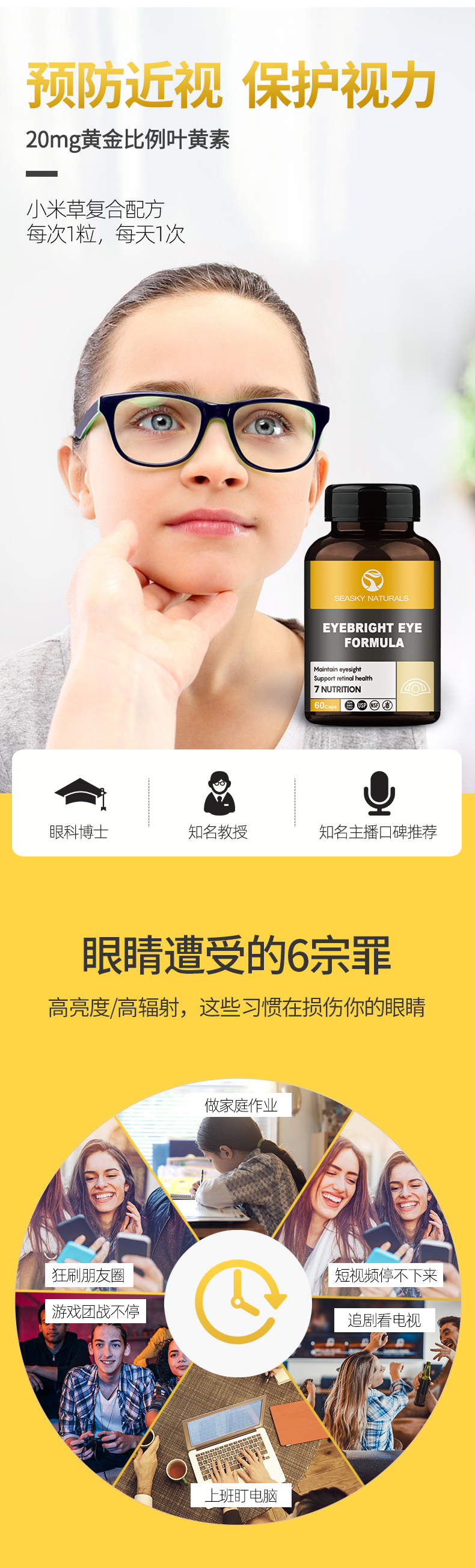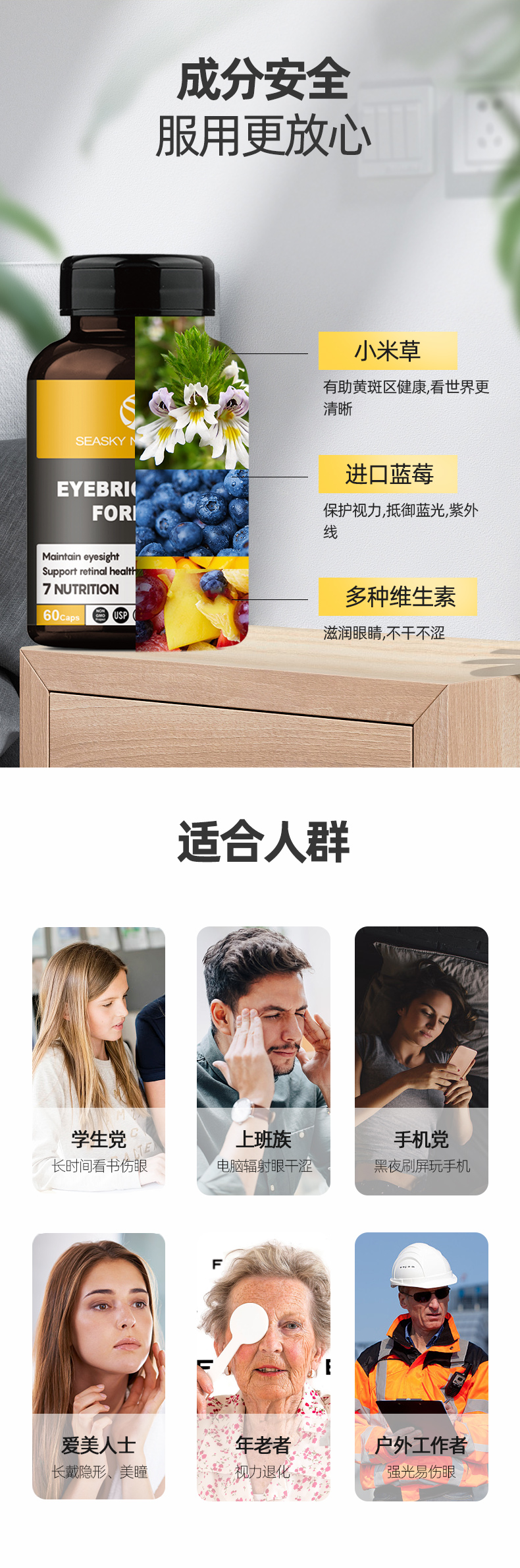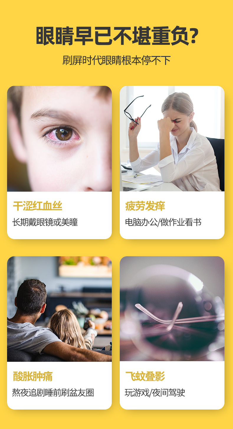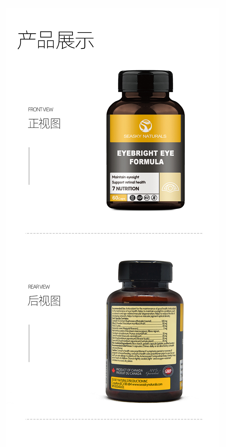加拿大原装进口,品牌直供,复合配方,含有小米草、叶黄素,蓝莓,越桔粉,黑加仑,甜樱桃,胡萝卜粉等10余种天然植物成分,安全无副作用,预防近视弱视,缓解眼睛干涩和疲劳,上班族、学生党等必备。